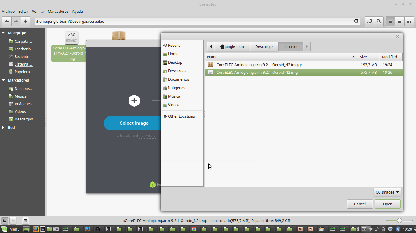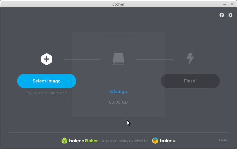 Abrimos el programa etcher y pulsamos sobre select image y seleccionamos nuestro sistema coreelec que hemos descargado