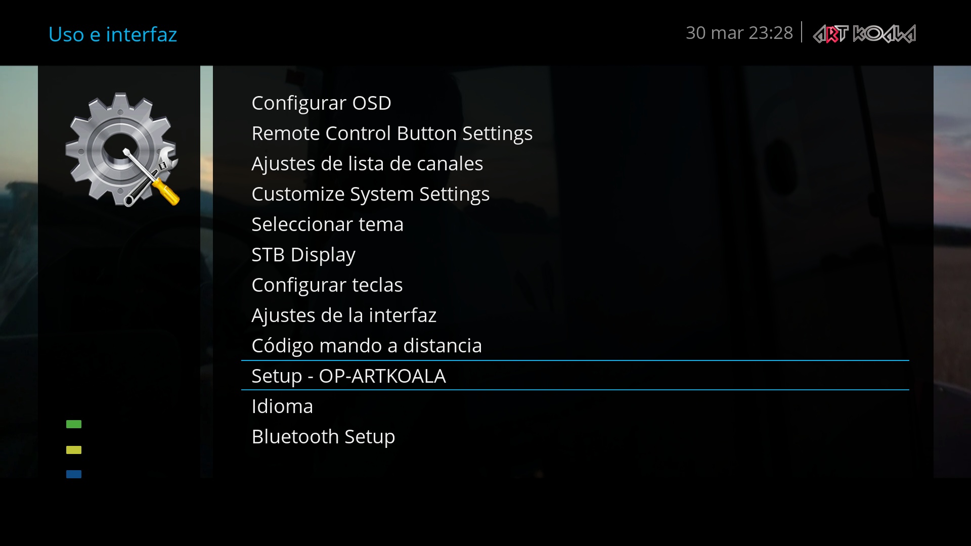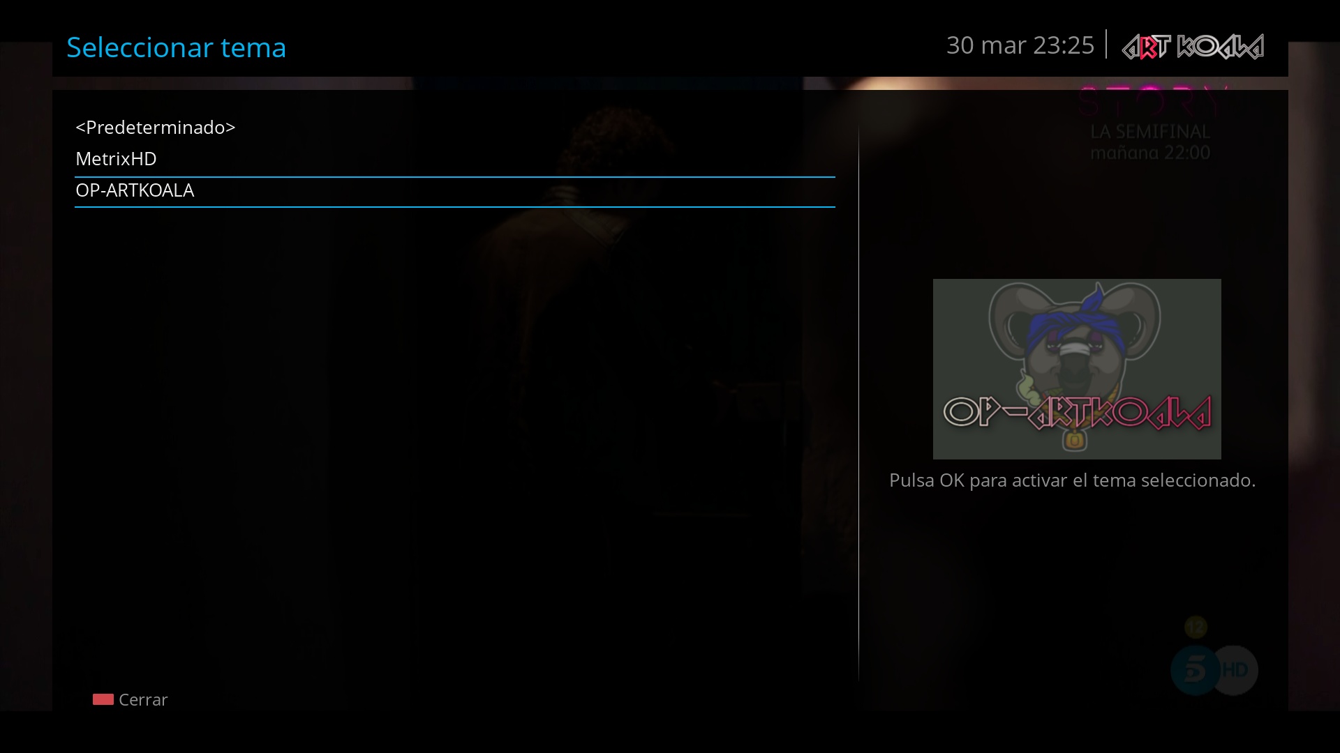Una vez instalado el skin, debemos seleccionarlo para arrancar el receptor con el mismo, para ello lo seleccionamos en menu + configuracion + user interfaz + seleccionar tema + OP-ARTKOALA