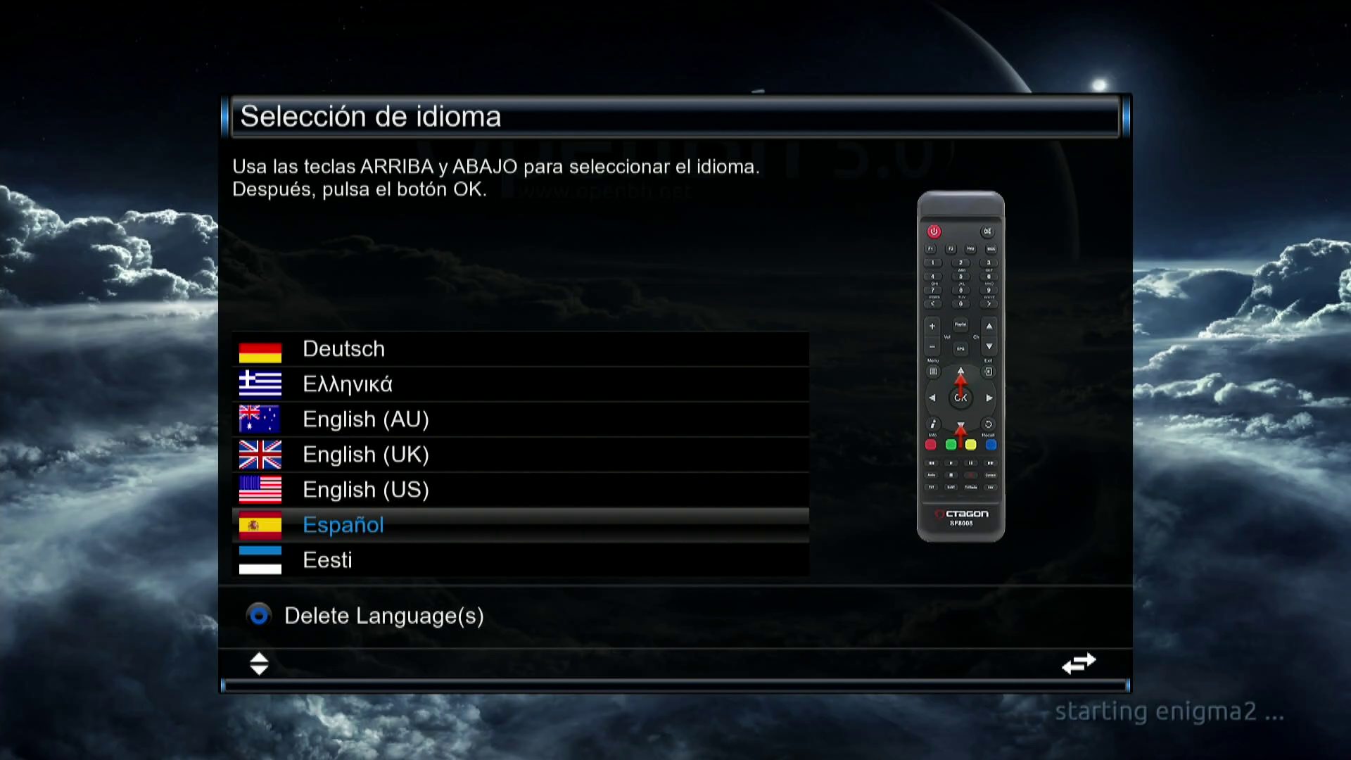 Una vez arranca la imagen OpenBh en nuestro receptor Octagon SF8008, nos aparece el wizard tipico enigma2, en este caso con skin BackShadow SE: