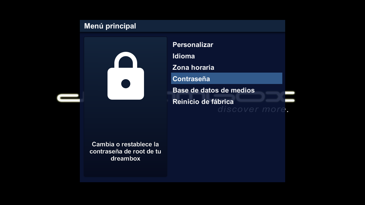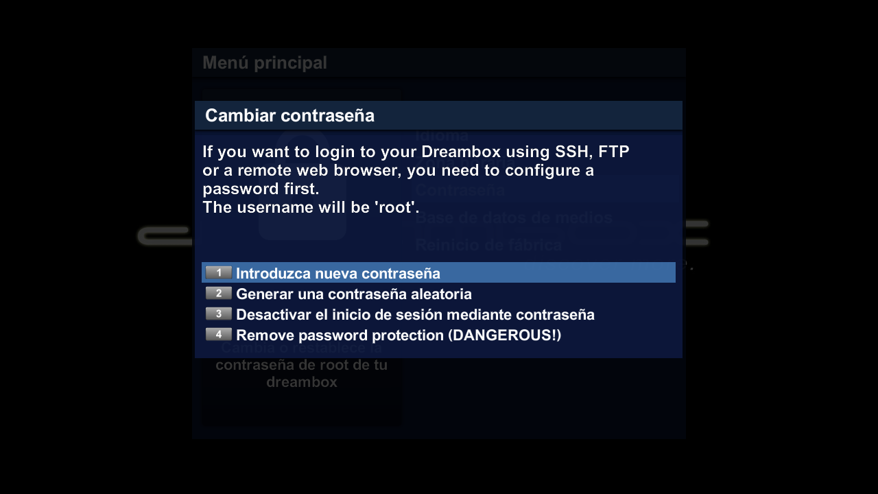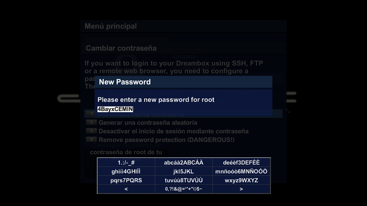 La imagen por defecto no tiene password para acceder, para asignarle una contraseña lo podemos realizar desde el menu del receptor: