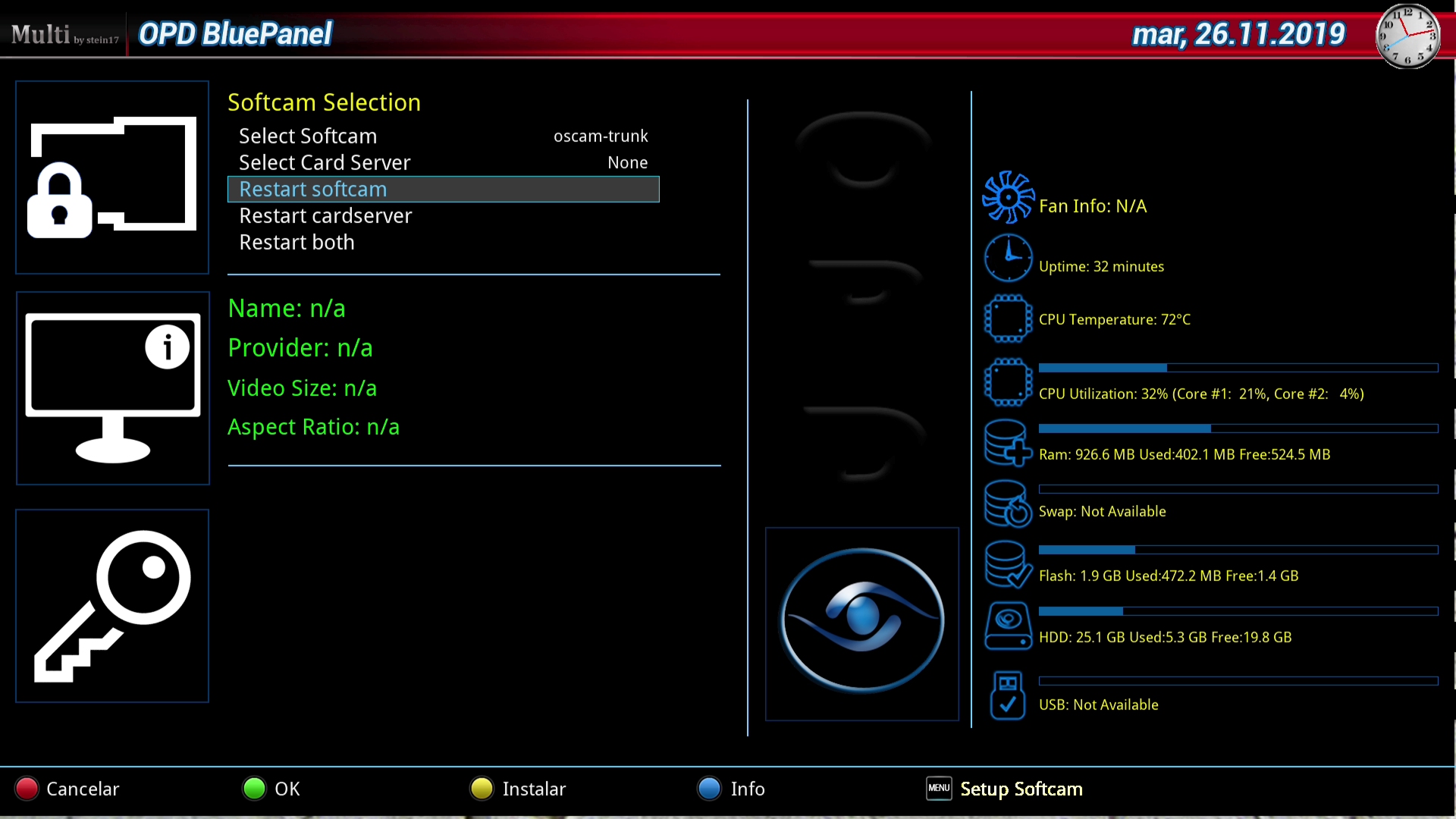 Para finalizar activamos la cam instalada, para ello pulsamos boton azul seleccionamos la cam a activar y pulsamos sobre restart softcam