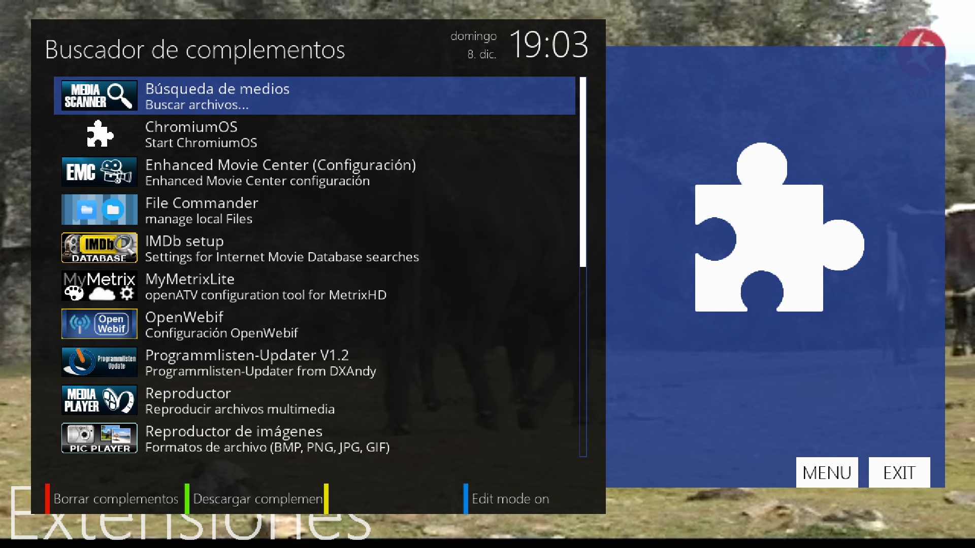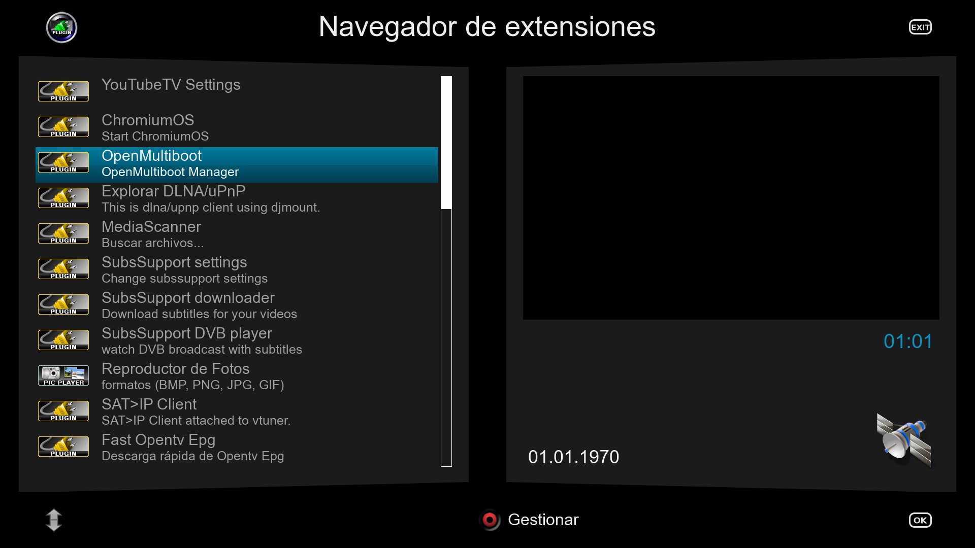 Ahora vamos a proceder a la instalacion de openmultiboot pulsamos menu + complementos + boton verde y en la categoria extensions buscamos openmultiboot