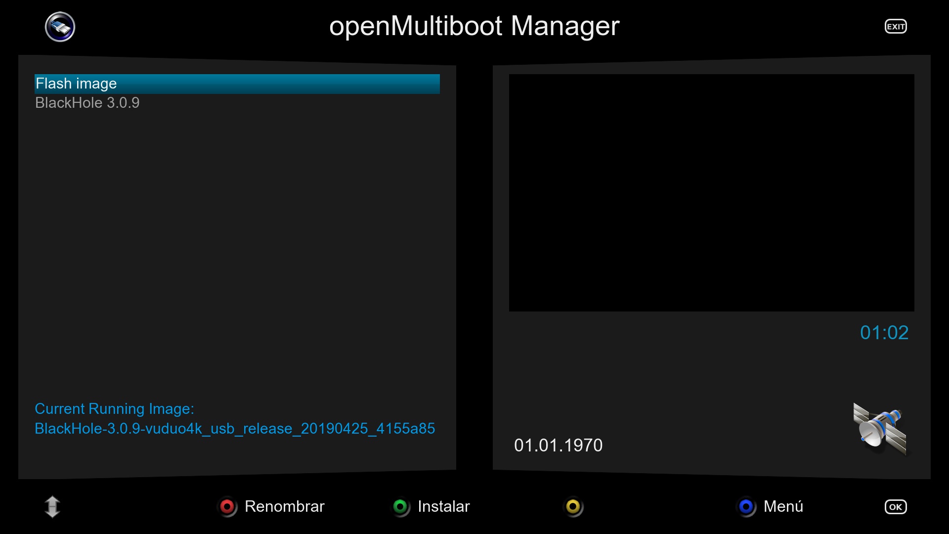 Y tras reinciar el receptor este se iniciara con la imagen seleccionada en este ejemplo blackhole
