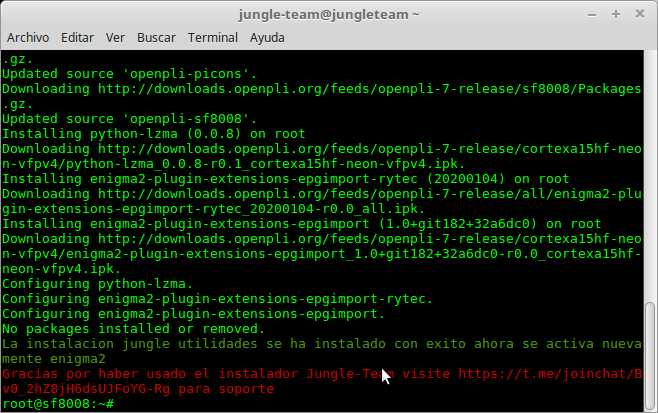 Una vez hemos realizada la primera configuracion del receptor, desde jungle-team os hemos preparado para que desde un simple comando, podamos tener en nuestro receptor instalado todo lo necesario para el funcionamiento basico del receptor, que podriamos decir que es una mezcla entre auto instalacion y backup, para ello, como hemos mencionado tras realizar la primera configuracion antes descrita, accedemos al receptor por terminal y ejecutamos el siguiente comando: