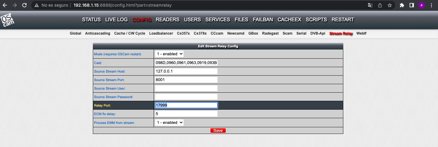 1. En primer lugar debemos saber que puerto streamrelay usa icam para asignarlo en la creacion del favorito, o si desearamos cambiar este puerto, para ello simplemente accedemos a la webif de oscam en la opcion streamrelay y observaremos que en este caso el puerto es 17999 , o si lo deseamos lo cambiamos por otro.