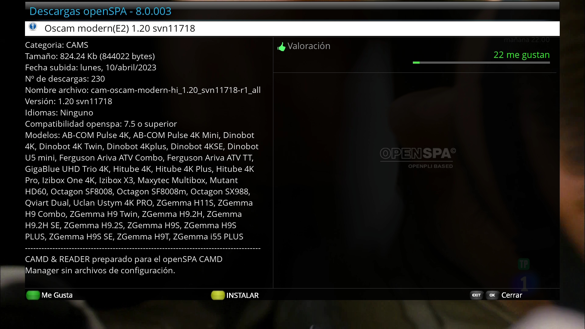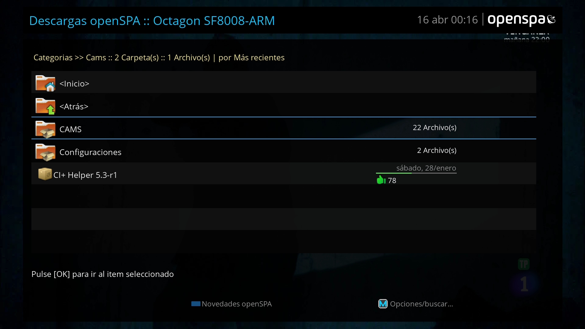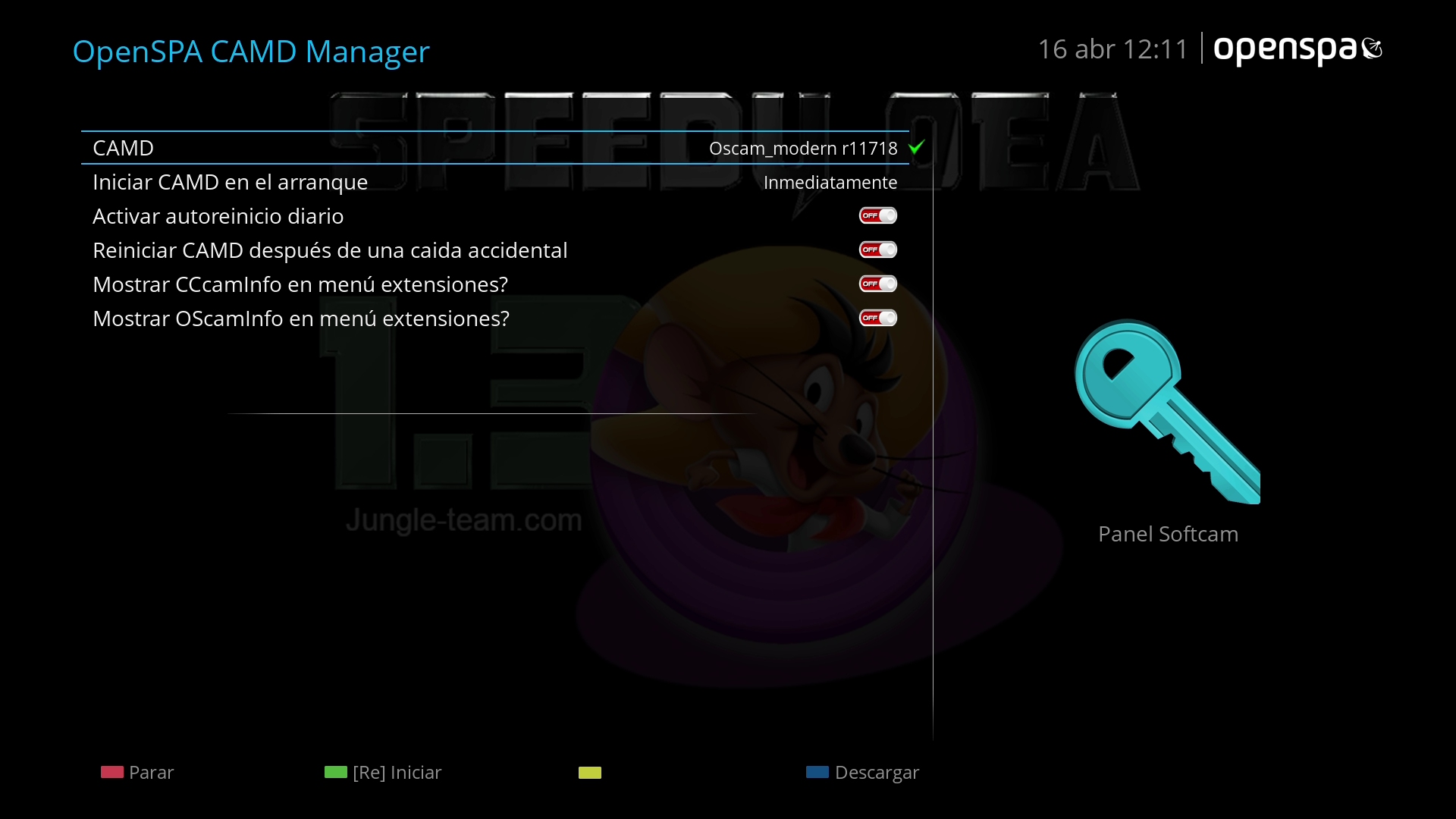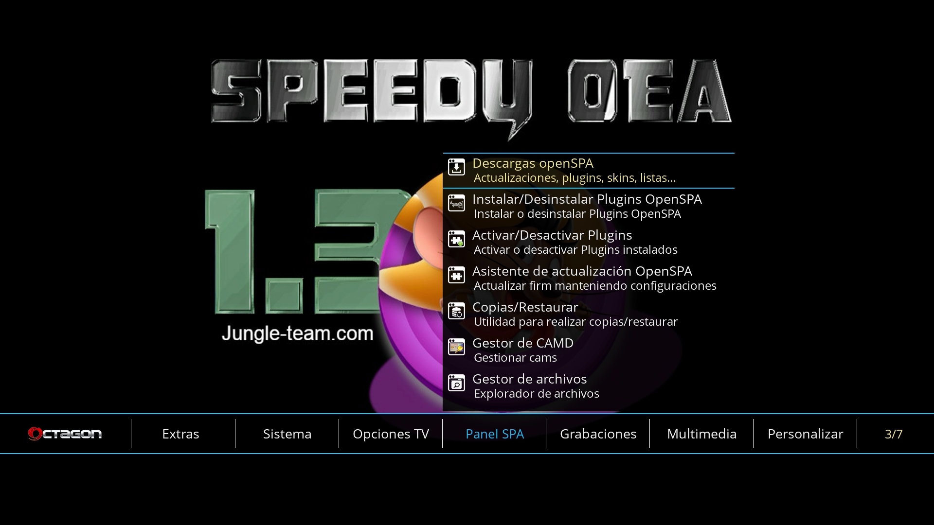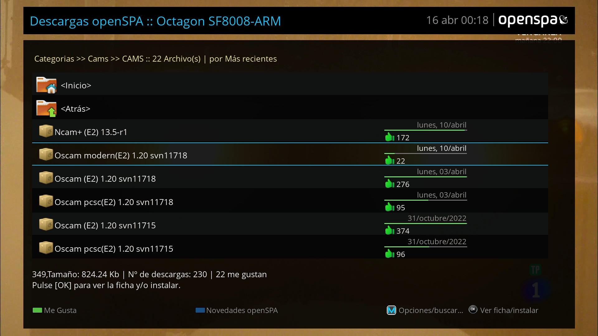 La version de oscam en openspa con el parche icam descargable desde sus repositorios es Oscam-modern 11718, por lo que para instalarla pulsariamos en menu + Panel Openspa + Descargas Openspa