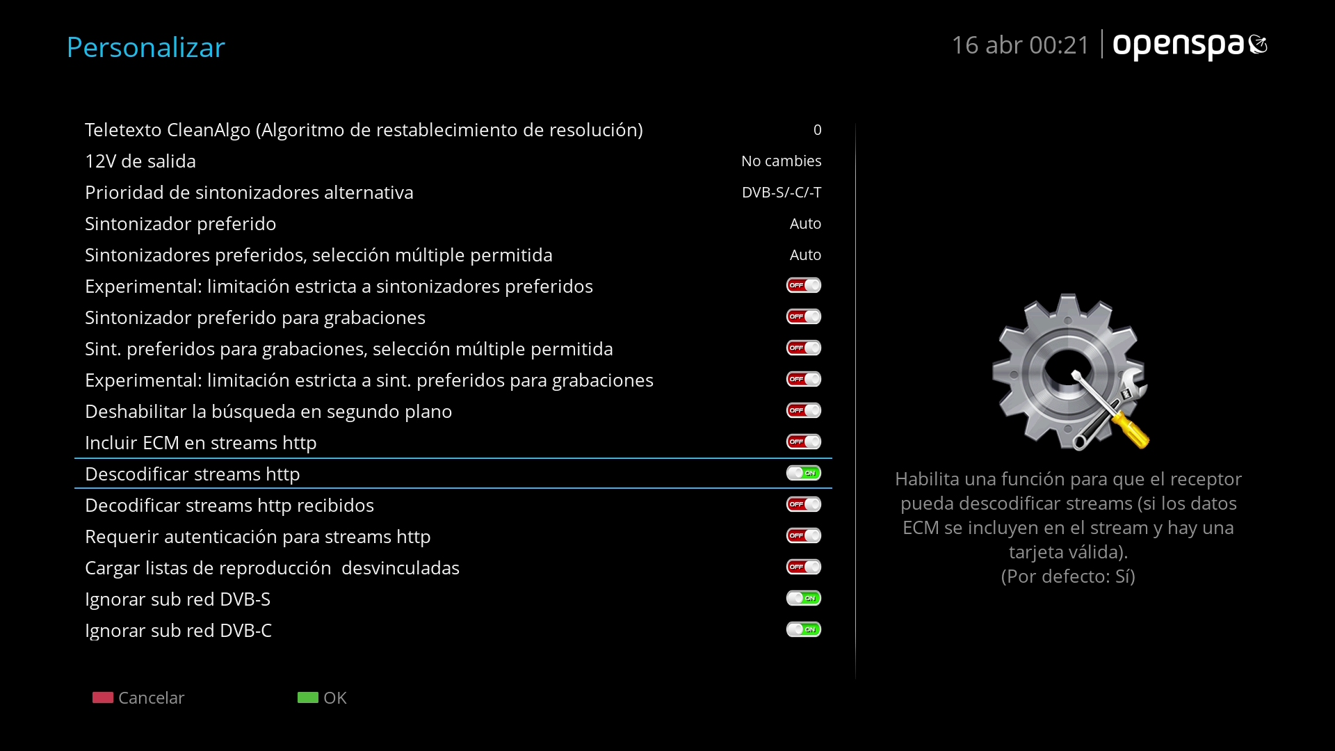 Para el uso de oscam-modern con el parche icam para algunas plataformas si usamos en el receptor Dvbapi de oscam que es lo normal, deberemos tener activada la opcion Descodificar Stream http para comprobarlo y activarlo en caso de que no lo este pulsamos en menu + configuracion del receptor + uso e interfaz + personalizar y activamos esta opcion en caso que estuviera desactivada.