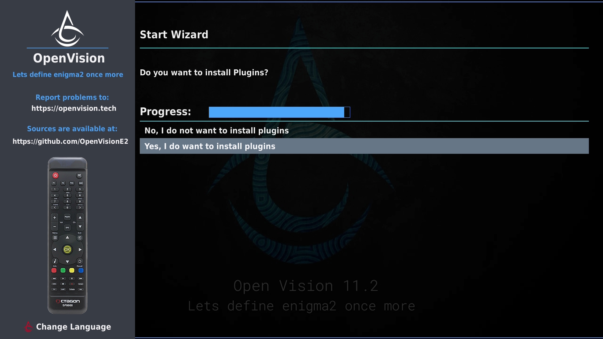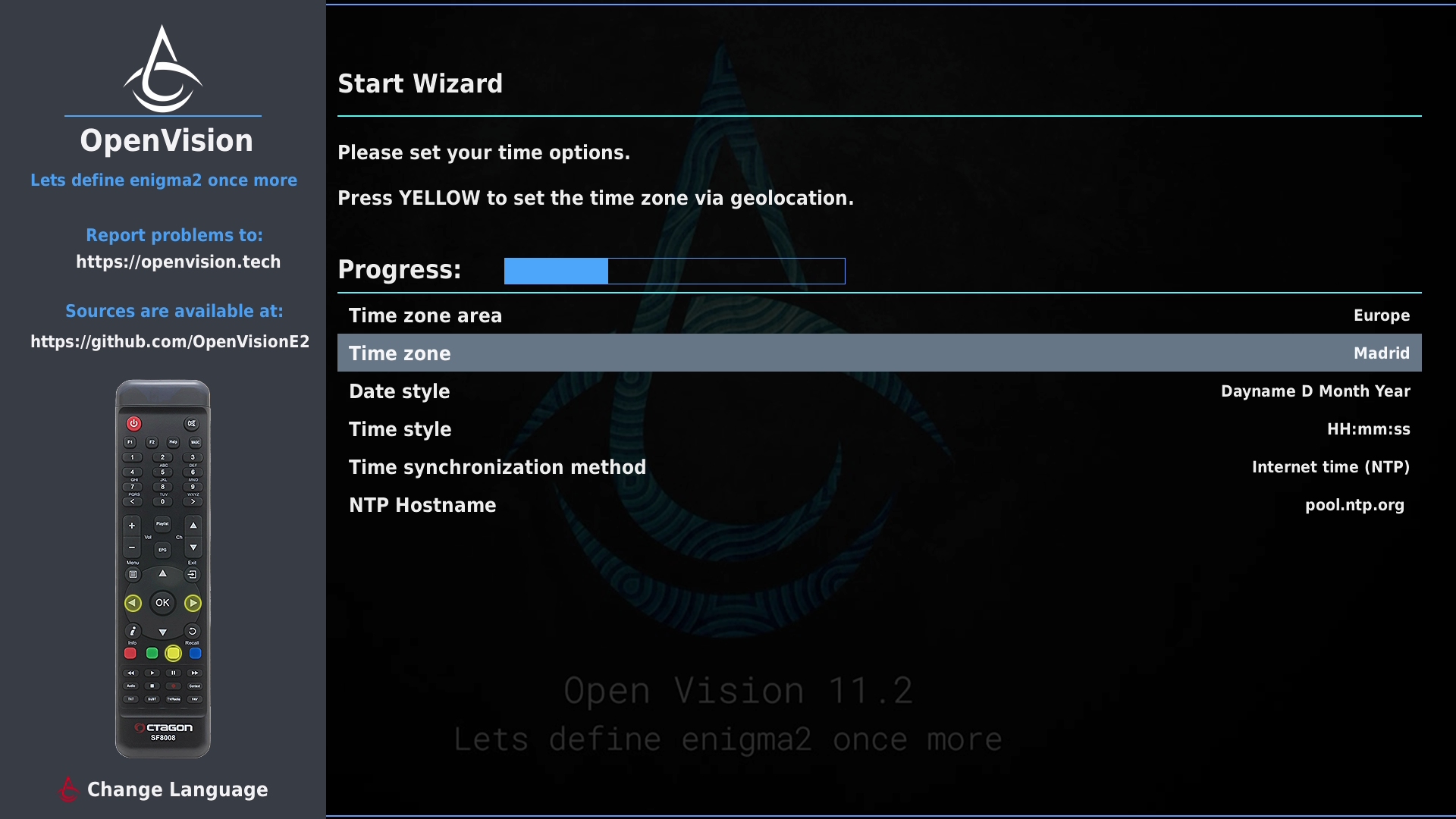 Tras realizar la primera instalación de Openvision, nuestro receptor arrancara con un wizard de configuracion, para realizar una primera configuracion básica del mismo (las configuraciones realizadas, si queremos pueden ser modificadas posteriormente en los distintos menus de la imagen).