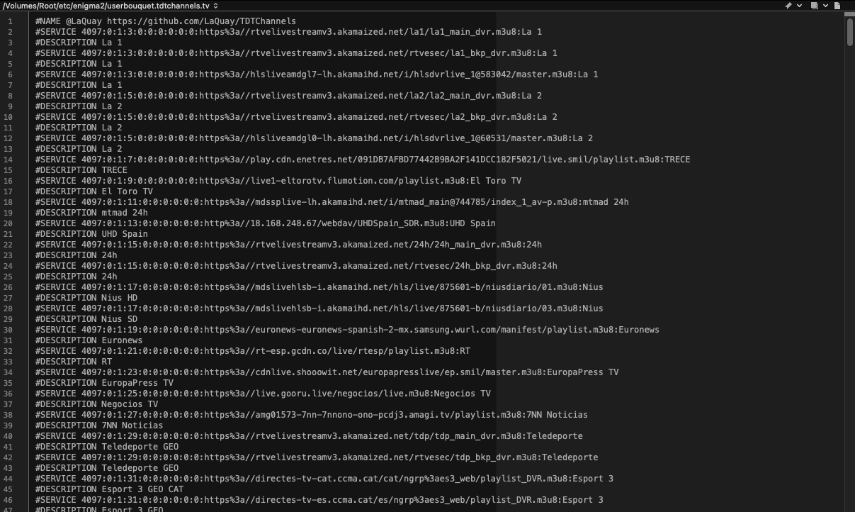 Por cada linea creamos un parcheo de un canal, para los service reference de los canales simplemente abrimos el bouquet de tdtchannels