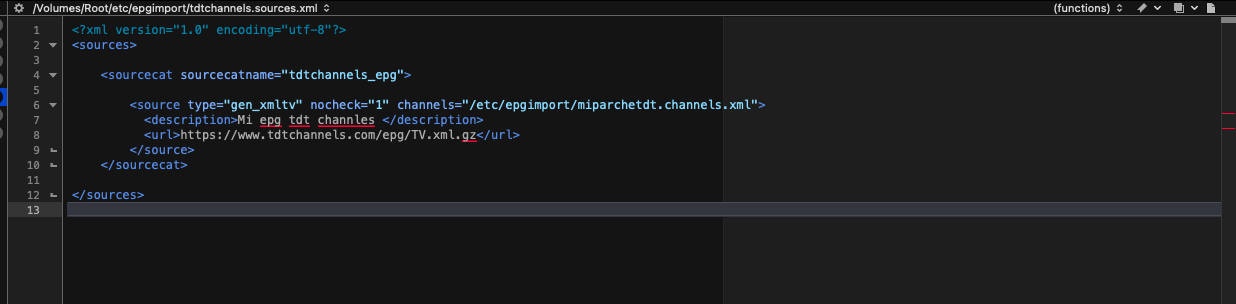 Para la descarga del epg en enigma2 se realiza con epgimport (es necesario previamente tenerlo instalado), una vez instalado vamos a crearnos nuestro source personalizado, para ello debemos crear un archivo llamado: xxxx.sources.xml, el cual lo debemos introducir en el directorio /etc/epgimport, el cual realizado de esta manera: