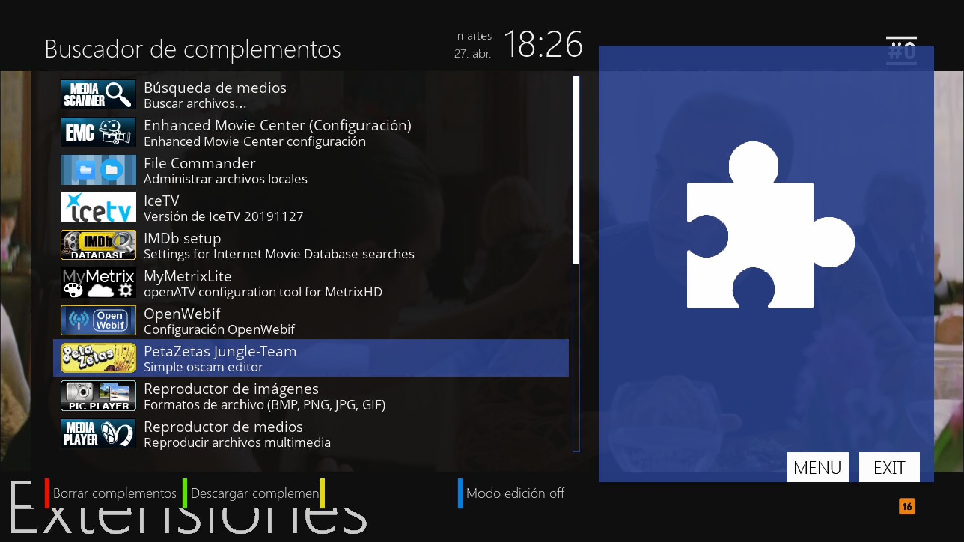 Ahora simplemente en el caso de openatv en menu + complementos nos aparecera para iniciar el plugins: