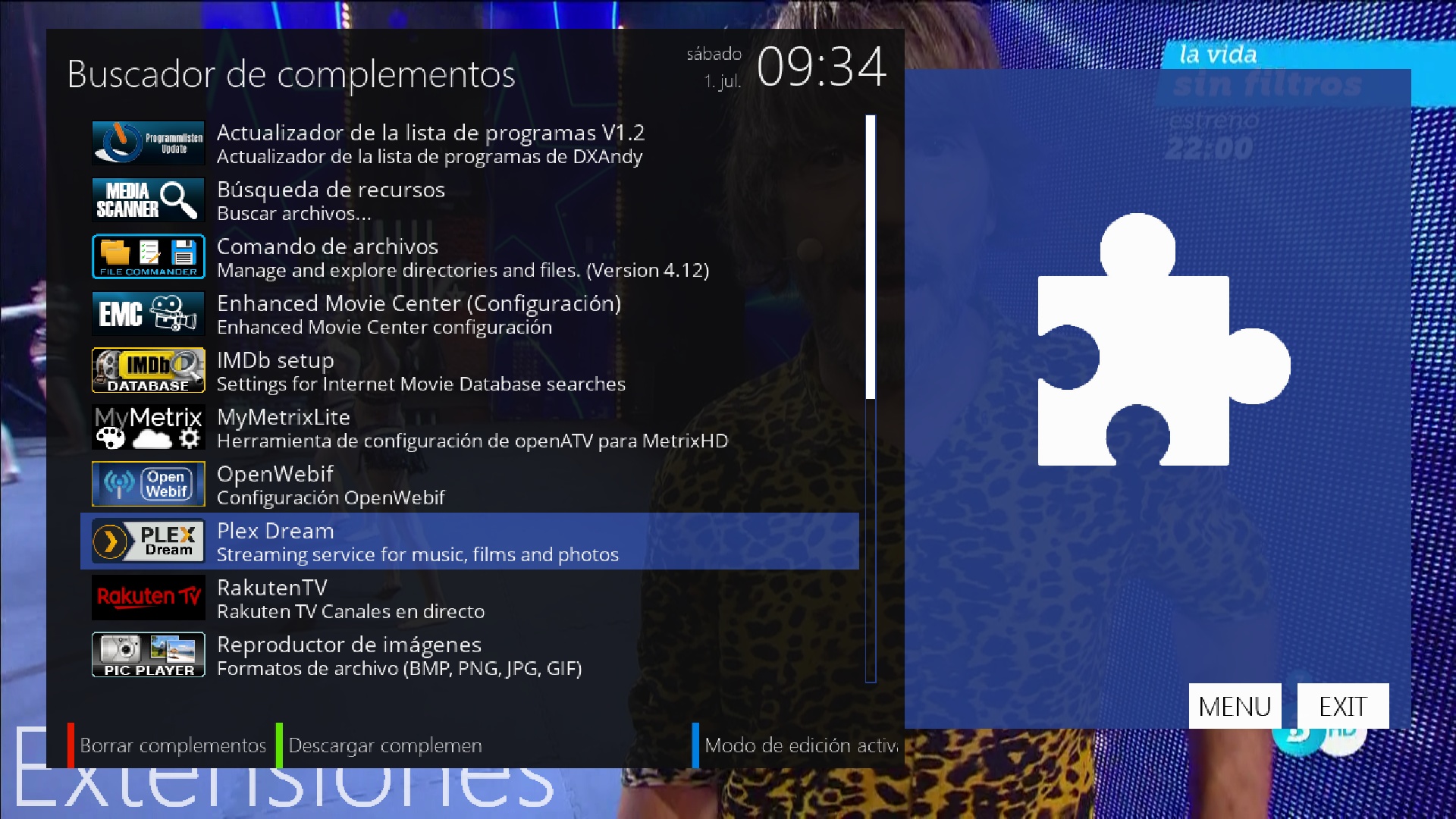 Una vez realizada la instalacion de PlexDream, nos aparecera en el menu complementos
