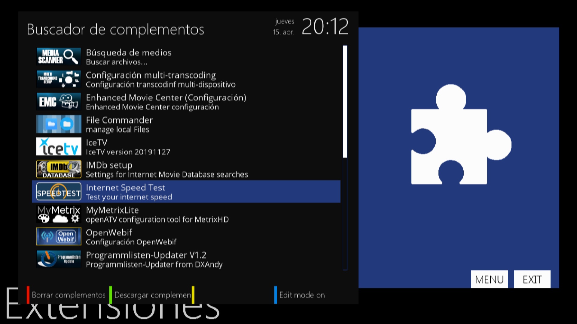 Para su uso accedemos a menu + complementos y pulsamos ok sobre internet speed Test