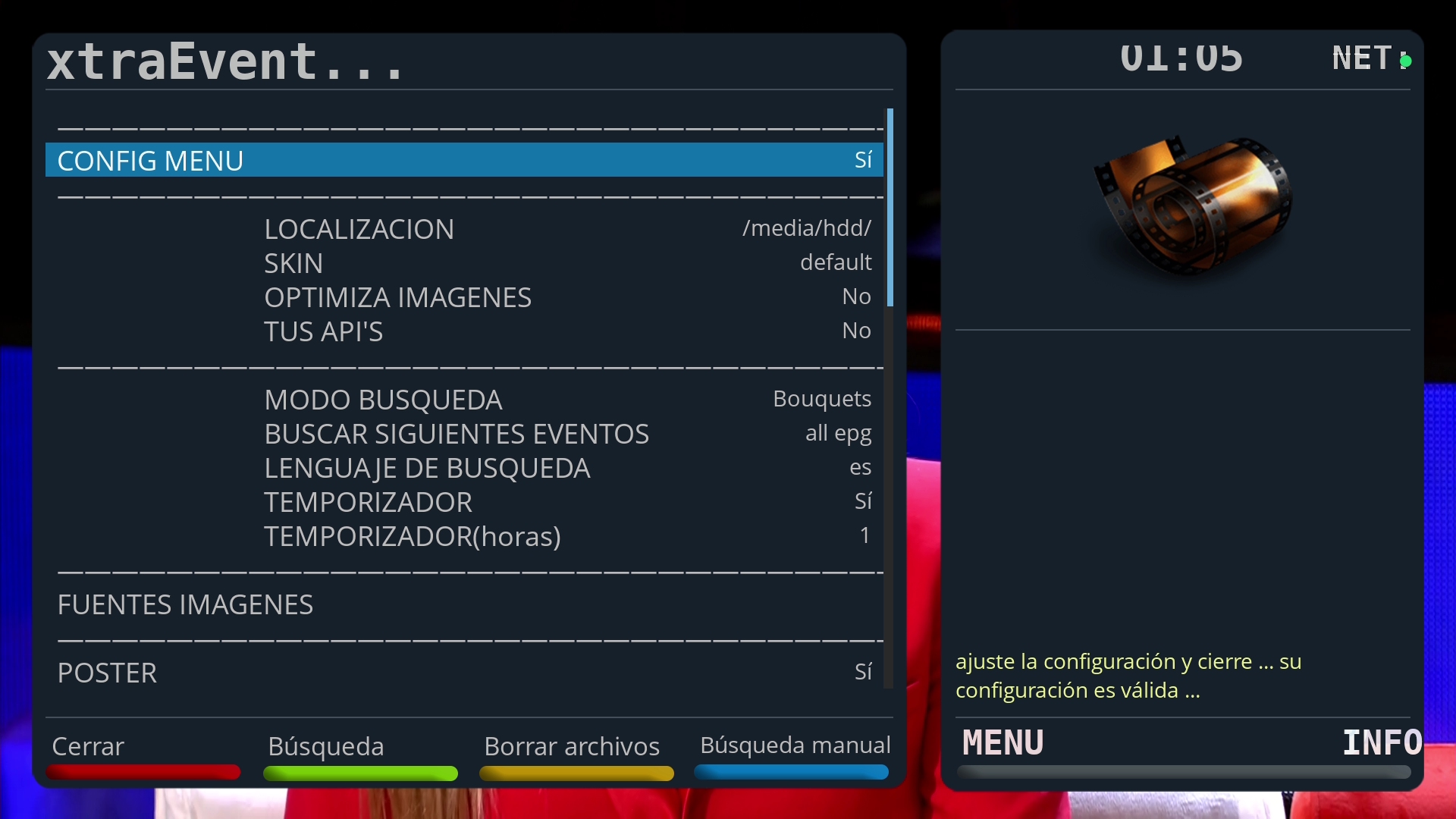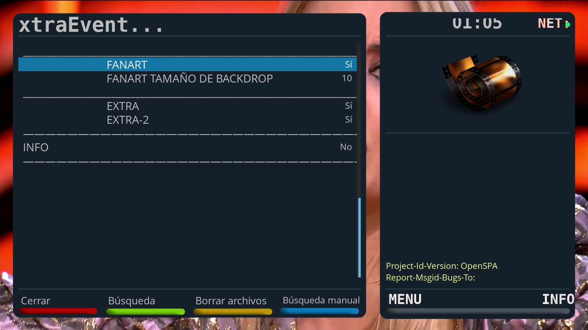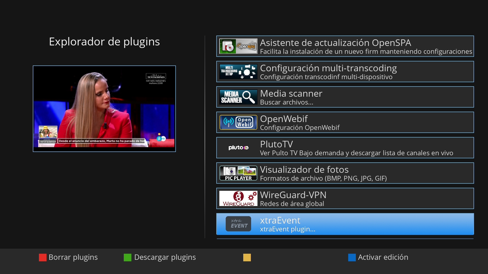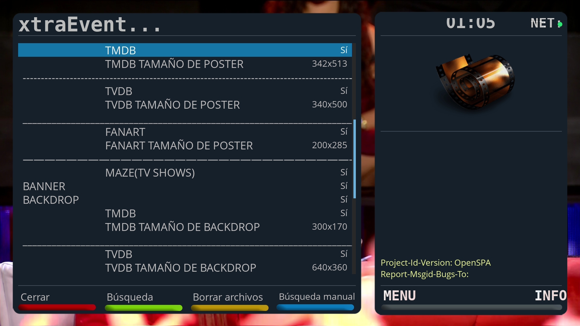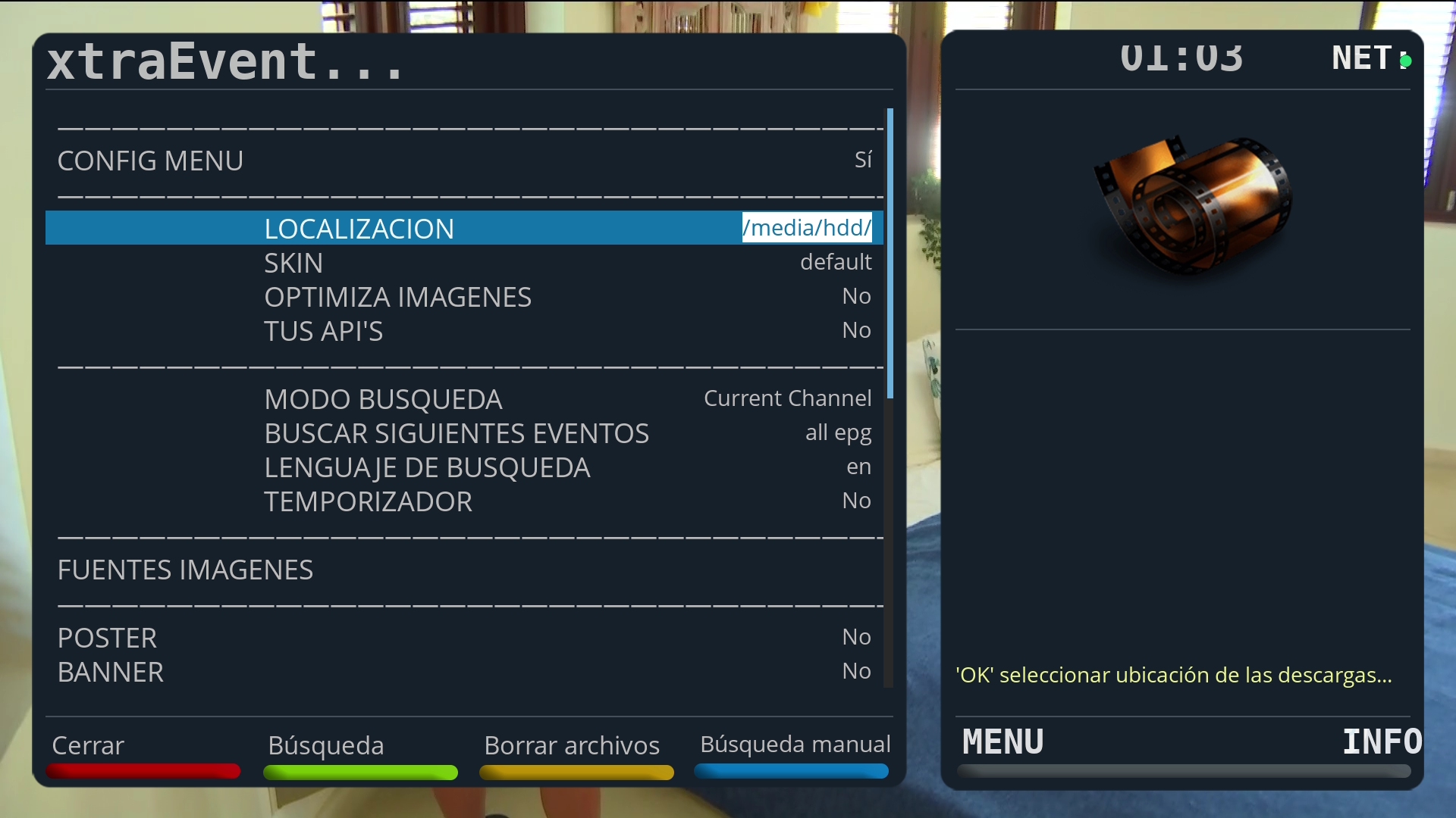 Nota: Antes del uso de XtraEvent es recomendable previamente haber descargado el EPG en la imagen Openspa y tener montado un pendrive o disco duro en el receptor (ya que el tamaño que produce la descarga de poster va a ocupar mucho tamaño por lo que no se debe usar la flash del deco para las descargas)