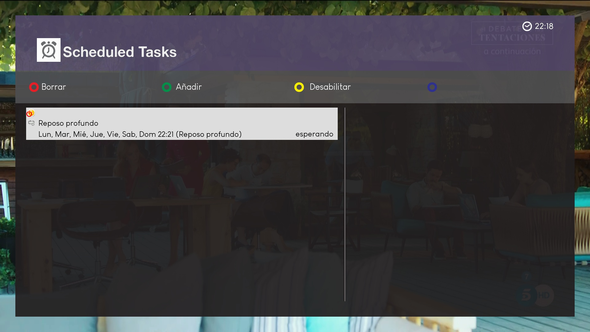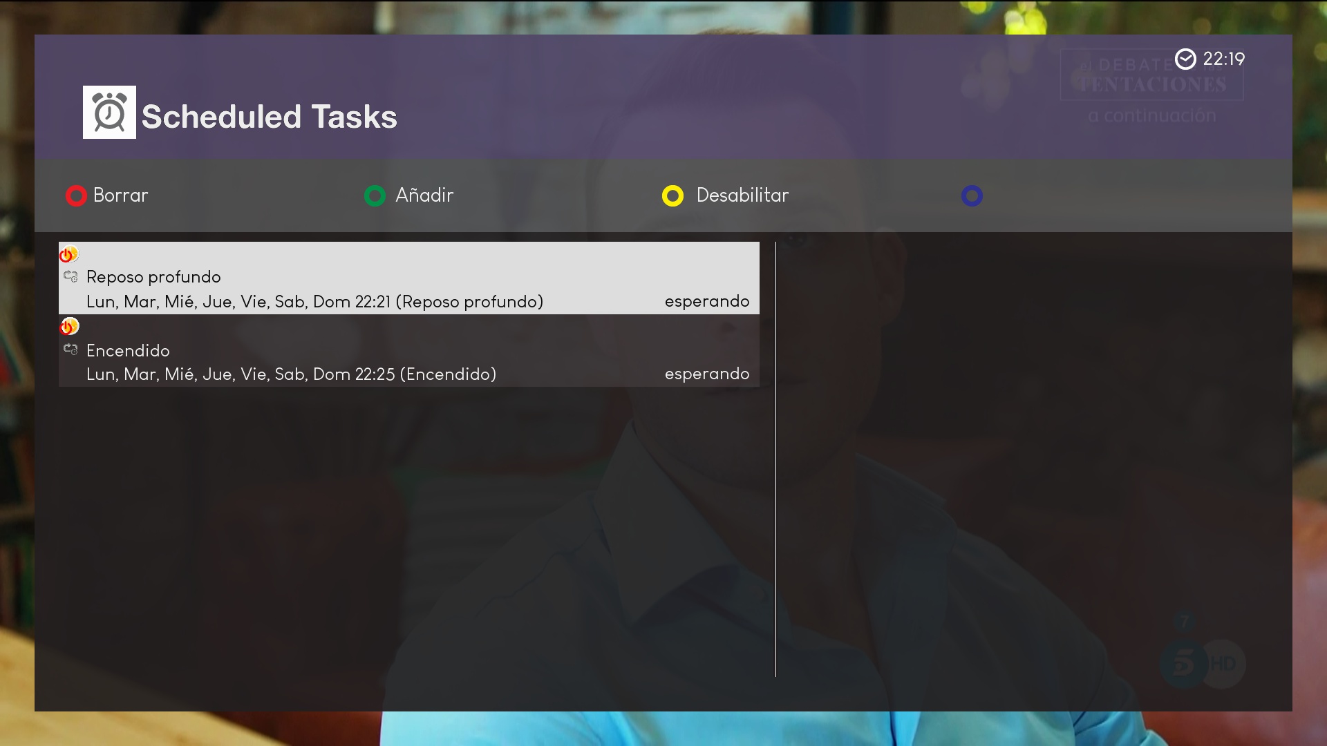 Si ademas deseamos que automaticamente a una hora el receptor se encienda pues añadimos con boton verde otra accion y en este caso: