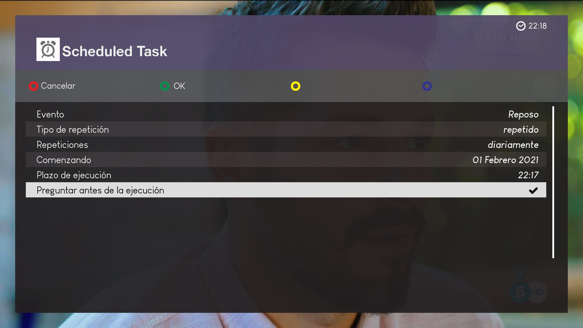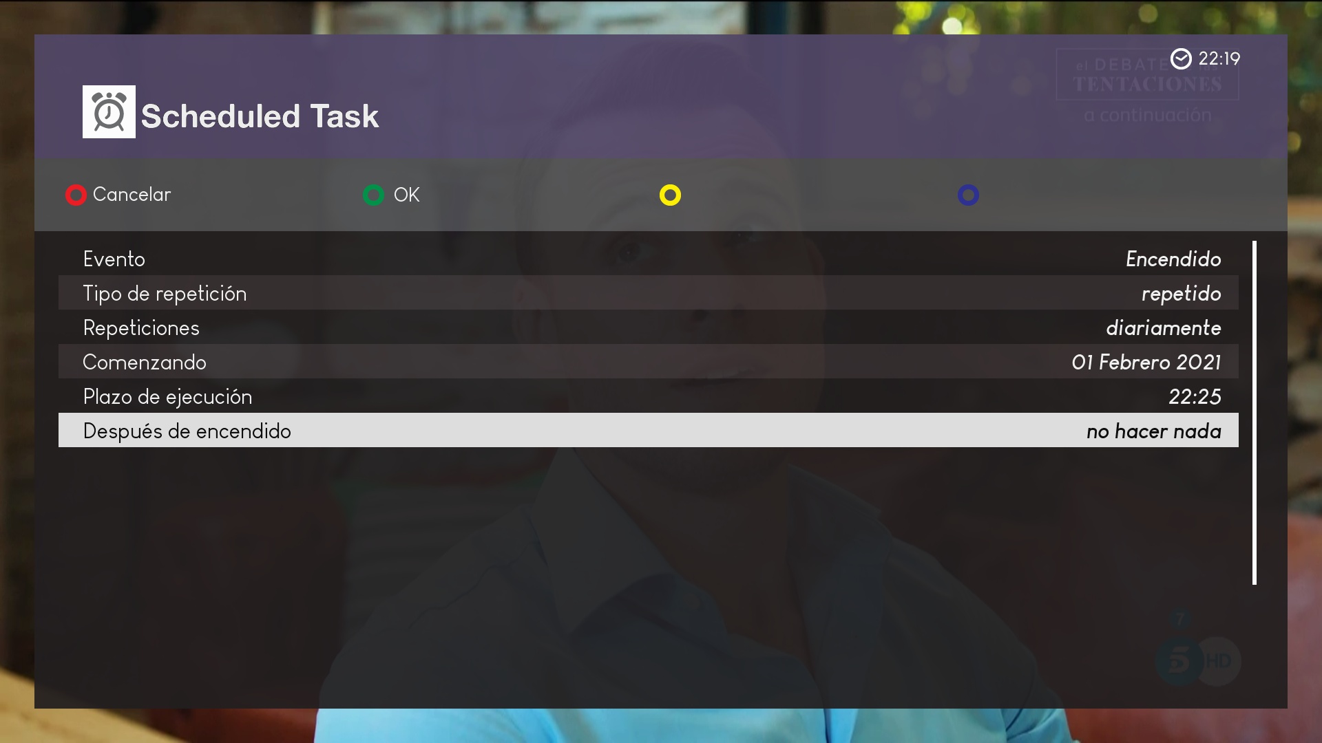 - Comenzando y plazo de ejecucion, el dia que deseamos empezar y en plazo de ejecucion la hora que deseamos encender el receptor (posterior al apagado que programamos)