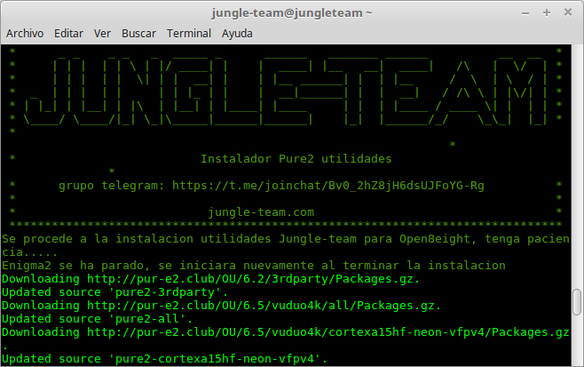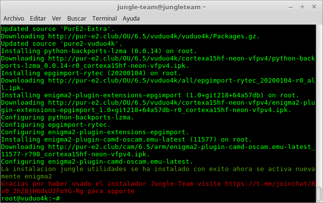 Una vez hemos realizada la primera configuracion del receptor, desde jungle-team os hemos preparado para que desde un simple comando, podamos tener en nuestro receptor instalado todo lo necesario para el funcionamiento basico del receptor, que podriamos decir que es una mezcla entre auto instalacion y backup, para ello, como hemos mencionado tras realizar la primera configuracion antes descrita, accedemos al receptor por terminal y ejecutamos el siguiente comando: