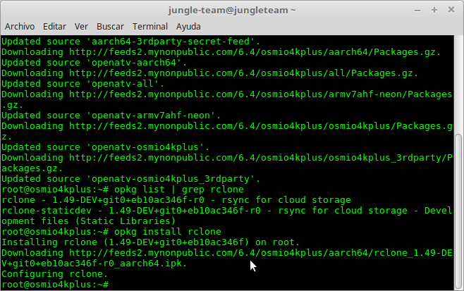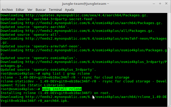 Como hemos mencionado rclone esta en los repositorios de la imagen OpenAtv, pues para realizar la instalacion accedemos por consola terminal y ejecutamos: