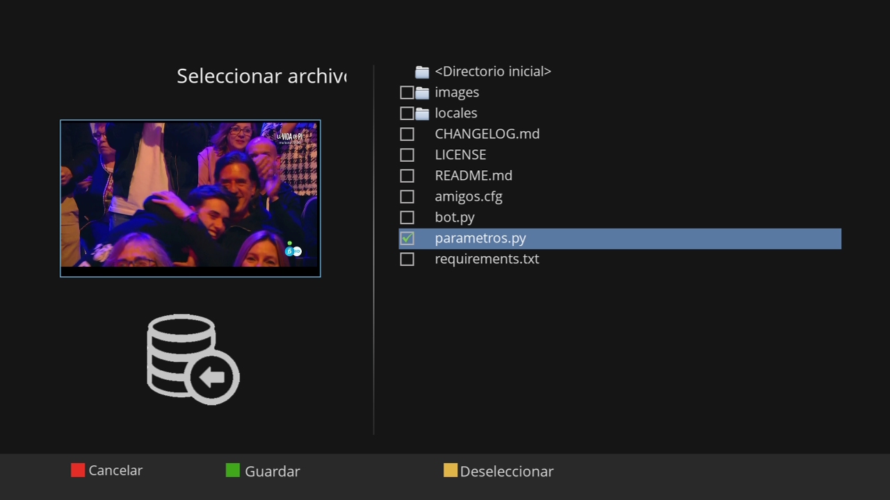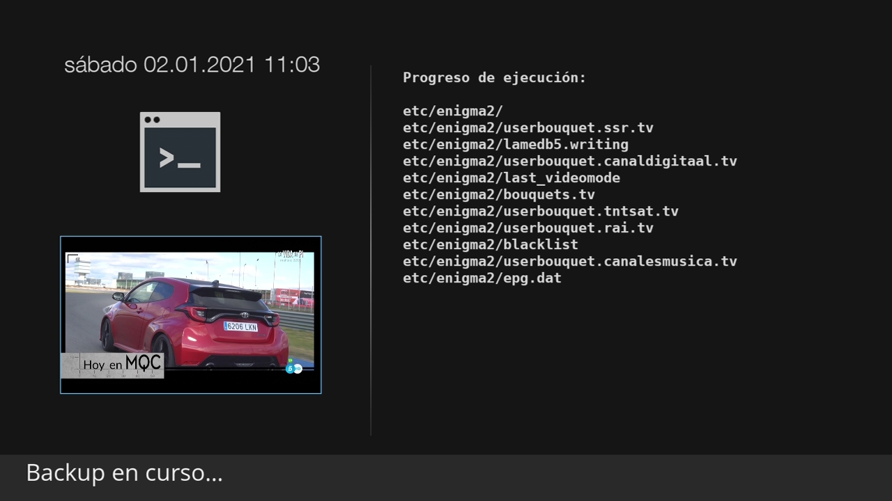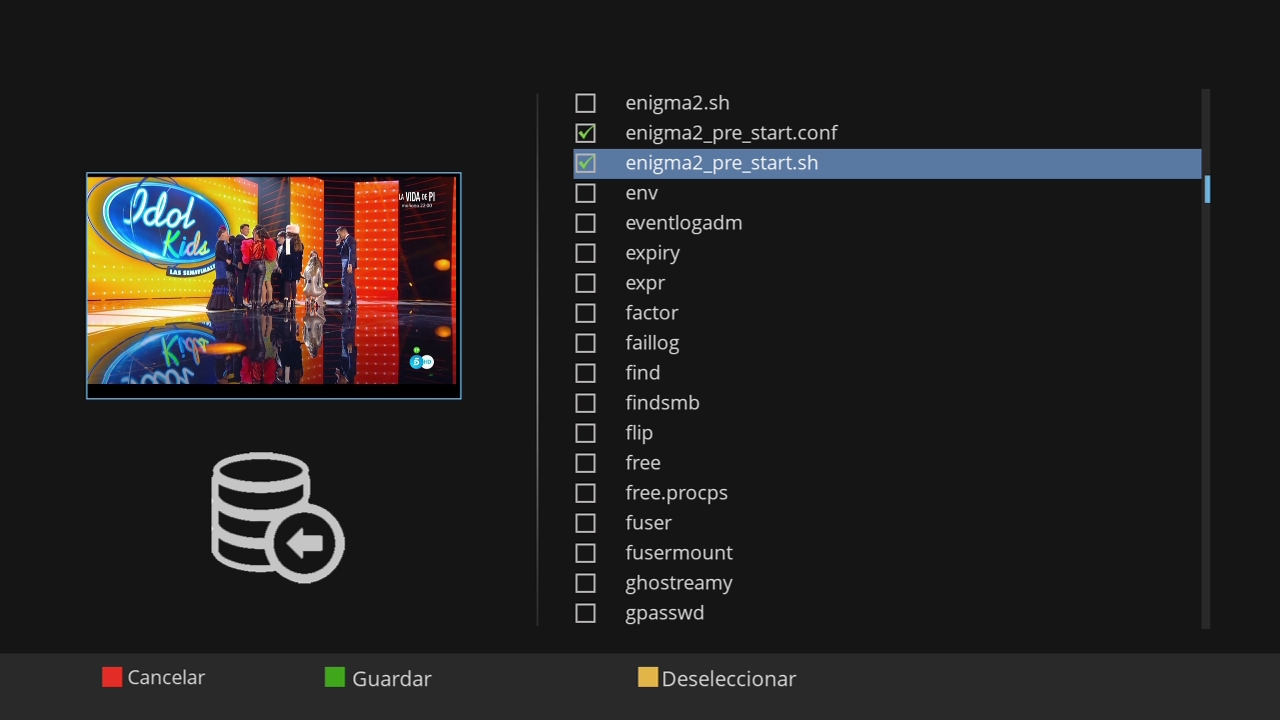 - Plugins instalados, en este caso hay que decir que no guarda los plugins instalados fisicamente, si no lo que hace es crear un archivo de texto donde se listan los plugins instalados en nuestro receptor, y que cuando se restaura intenta instalar los plugins de la lista desde los repositorios de la imagen, esto quiere decir que si hemos instalado un plugin externo a la imagen que no se encuentra en los repositorios de la imagen al intentar instalarlo no podra por que no se halla en los repositorios.