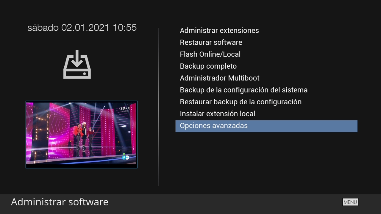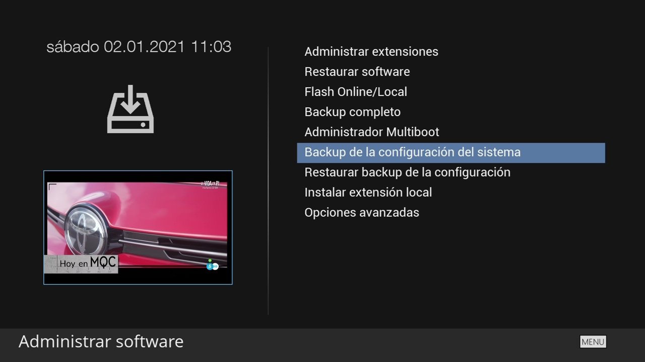 Una vez hemos añadido los archivos adicionales, para crear la copia de seguridad pulsamos en menu + configuracion + administrador de software + copia de seguridad de la configuracion y tras ello esperamos unos segundos y se creara.