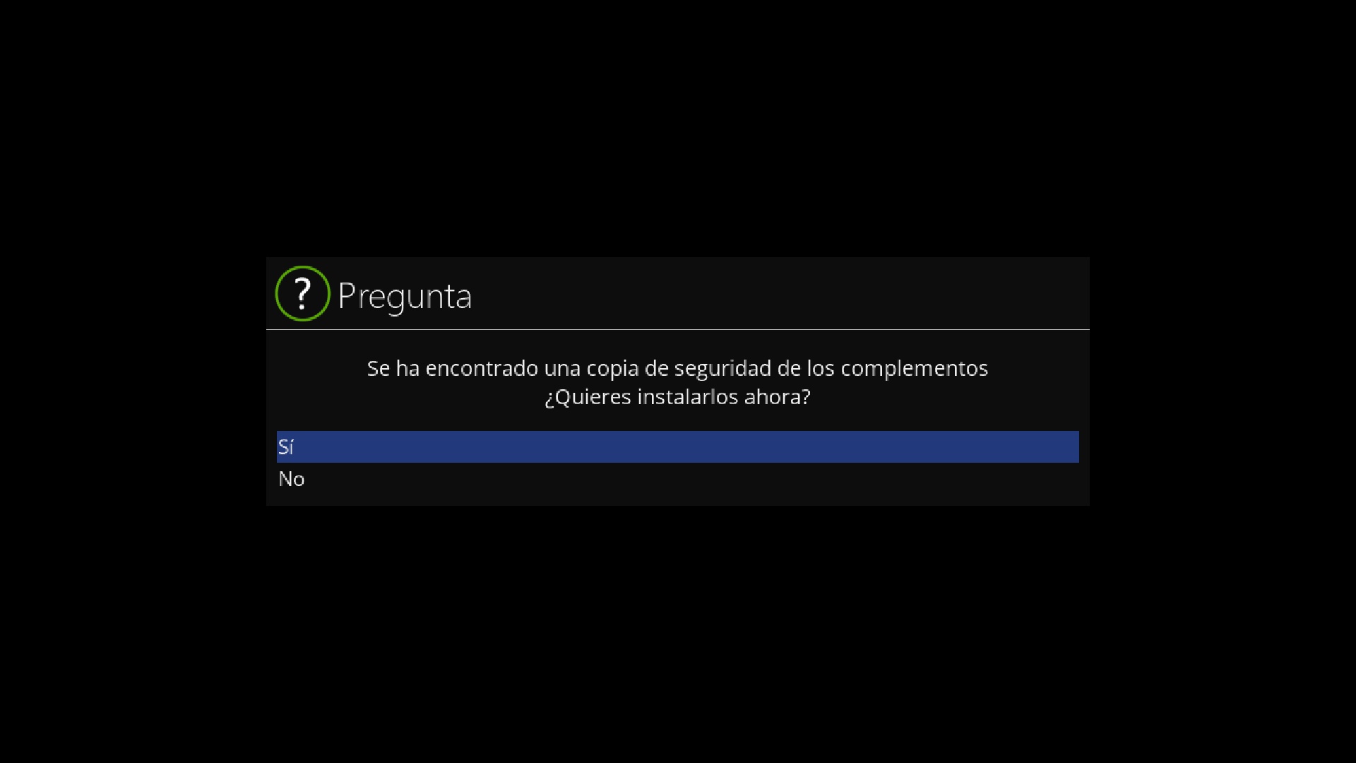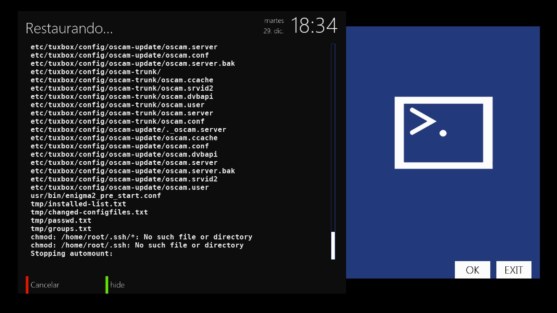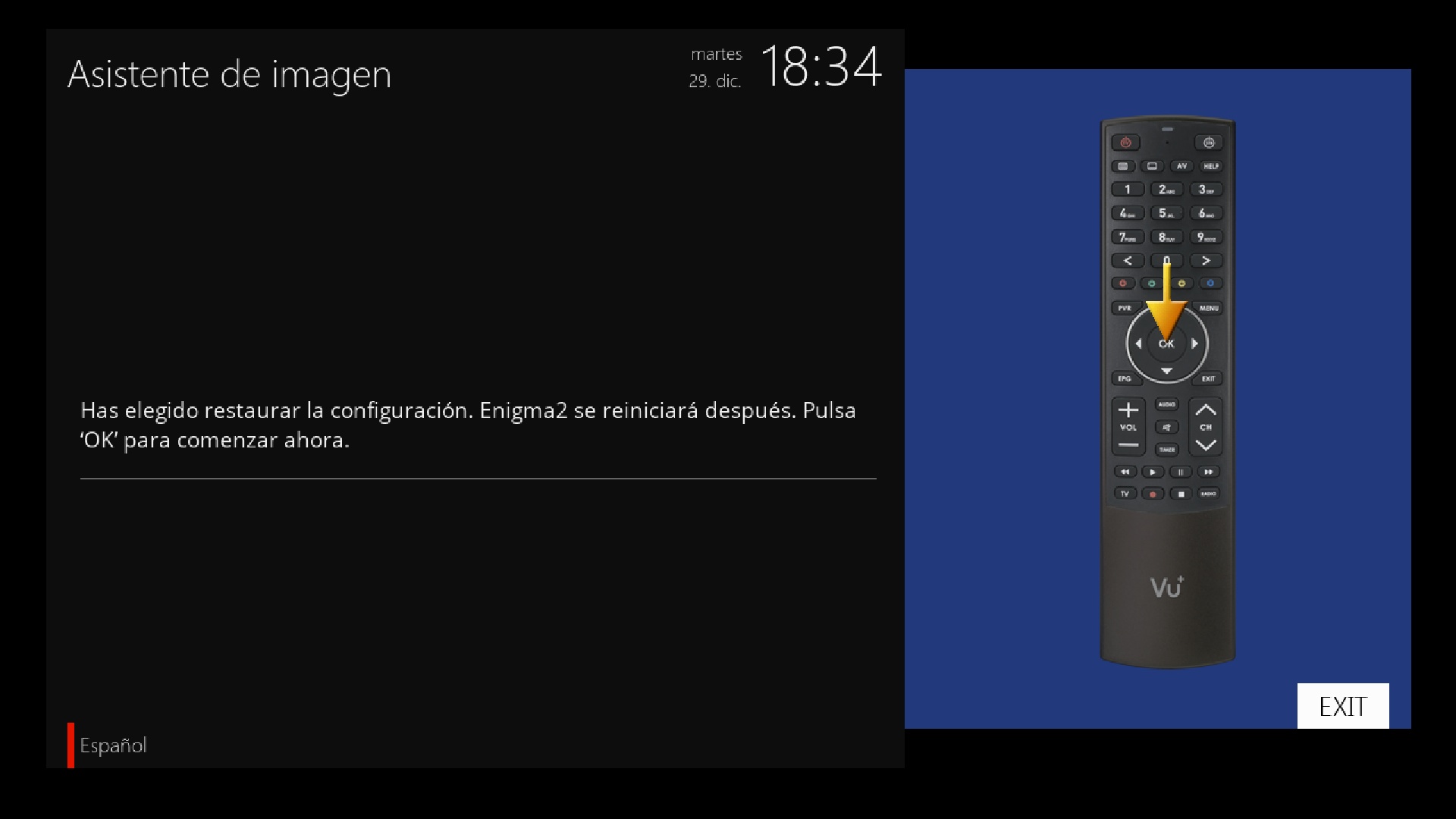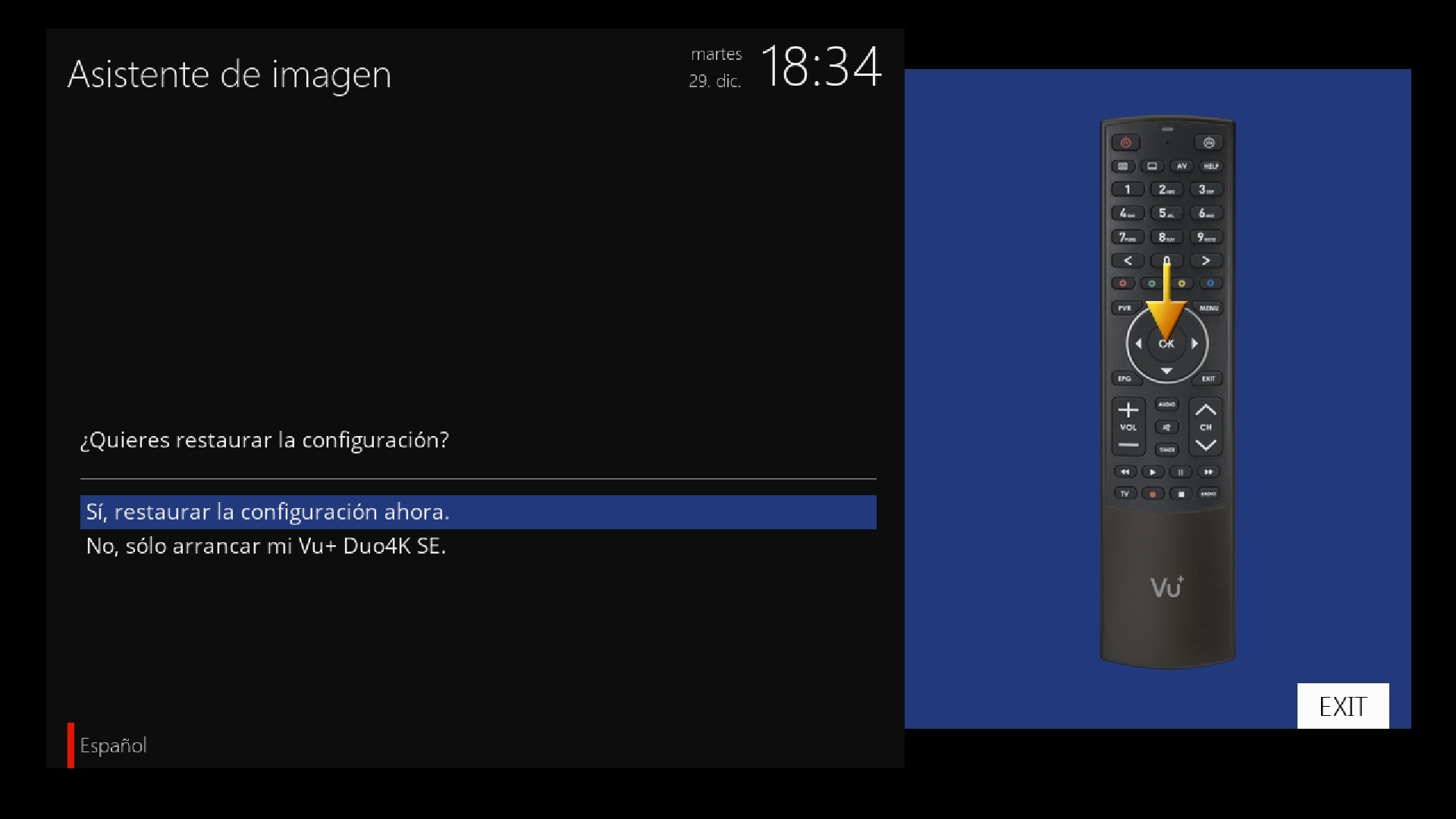 Una vez que en el wizard de configuracion hemos configurado idioma y tv, nos aparecera si deseamos restaurar la configuracion pulsamos en si, y en primer lugar nos restaurara los archivos de configuracion