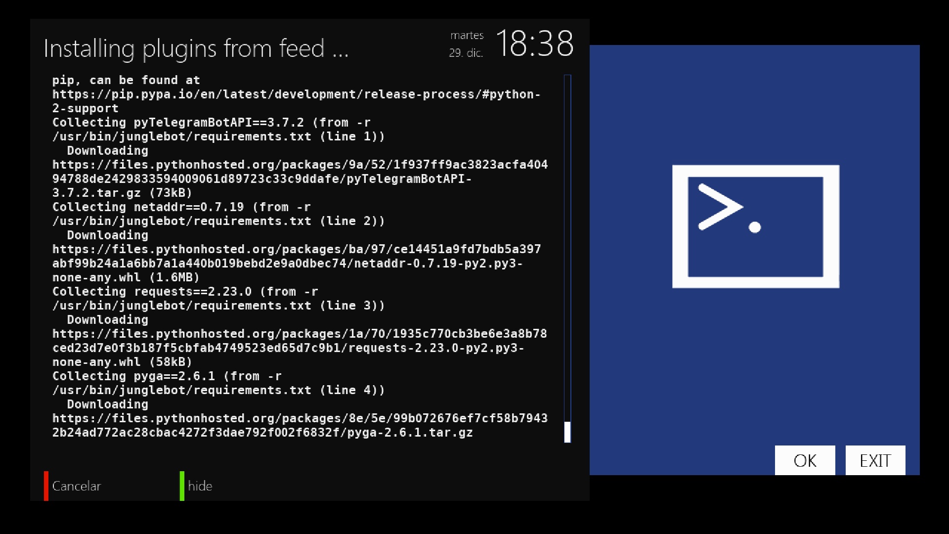 Ahora de los repositorios de la imagen comenzara la instalacion (por eso como dijimos cualquier plugin que no este en los repositorios de la imagen no lo instalara, por eso la importancia como vimos de guardar en adicionales el repositorio jungle-team para que pueda instalar junglebot, junglescript, etc…