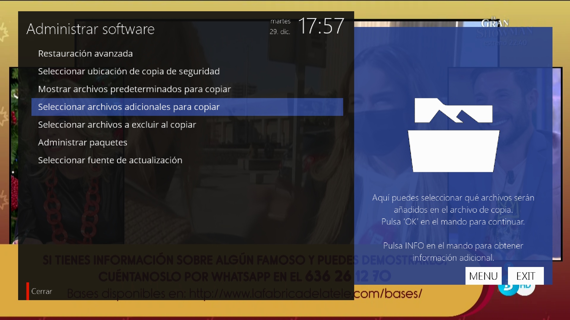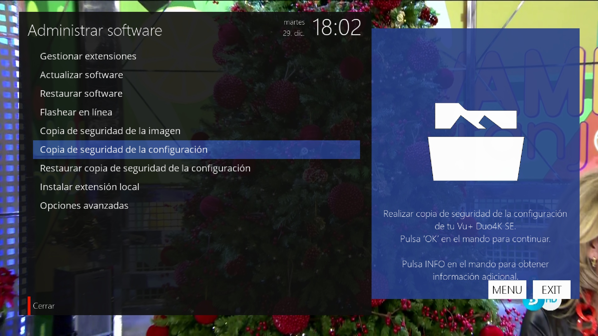 Una vez hemos añadido los archivos adicionales, para crear la copia de seguridad pulsamos en menu + configuracion + administrador de software + copia de seguridad de la configuracion y tras ello esperamos unos segundos y se creara.