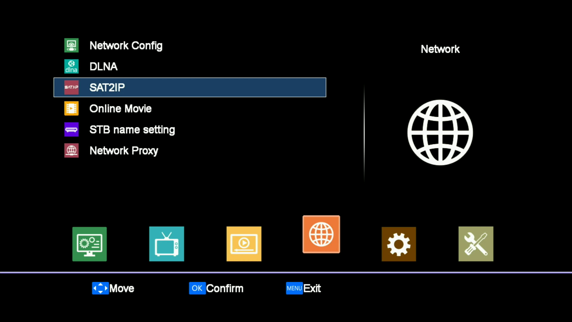 1.1. Pulsamos menu y seleccionamos el icono network a continuacion marcamos SAT2IP
