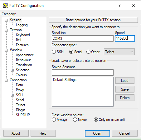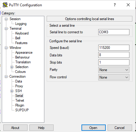 3. Abrimos el programa putty y marcamos Serial y en speed introducimos 115200 y en Serial Line el numero de puerto que vimos que nos aparece en administrador de dispositivos en este caso COM3
