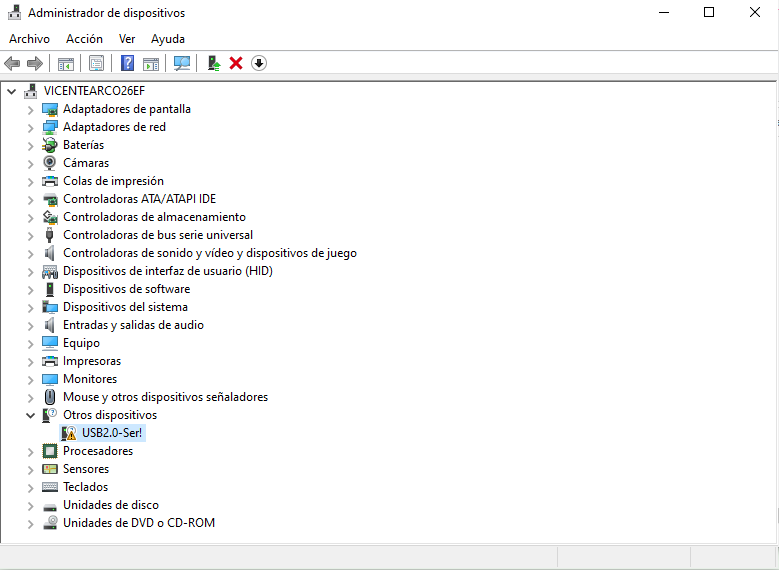 Como hemos comentado hoy en dia la mayoria de los pc no tienen entrada RS232, por ello necesitamos un adaptador usb-RS232, antes de comenzar vamos a comprobar que nuestro pc reconoce el adaptador para ello lo intruducimos en USB de nuestro PC y nos vamos a administrador de dispositivos y si vemos que no lo reconoce correctamente como es este ejemplo: