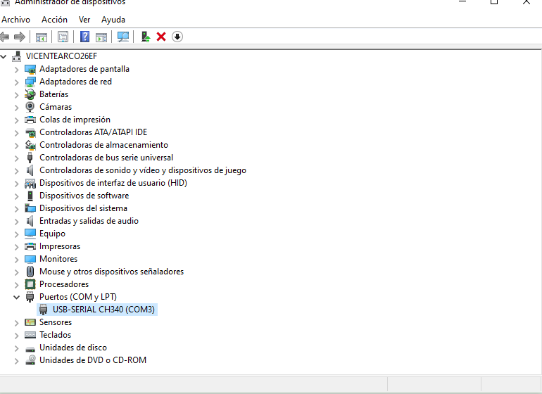 Deberemos pulsar boton derecho sobre el mismo y realizar la instalacion de drivers correspondiente a nuestro adaptador, en el caso del enlace de compra es chip C340.Una vez realizada la instalacion de drivers ya lo reconocera correctamente en este caso como COM3