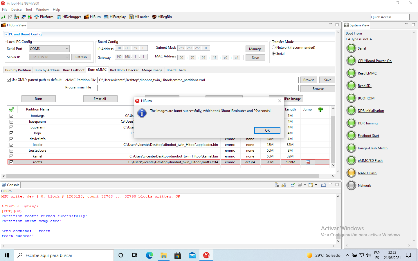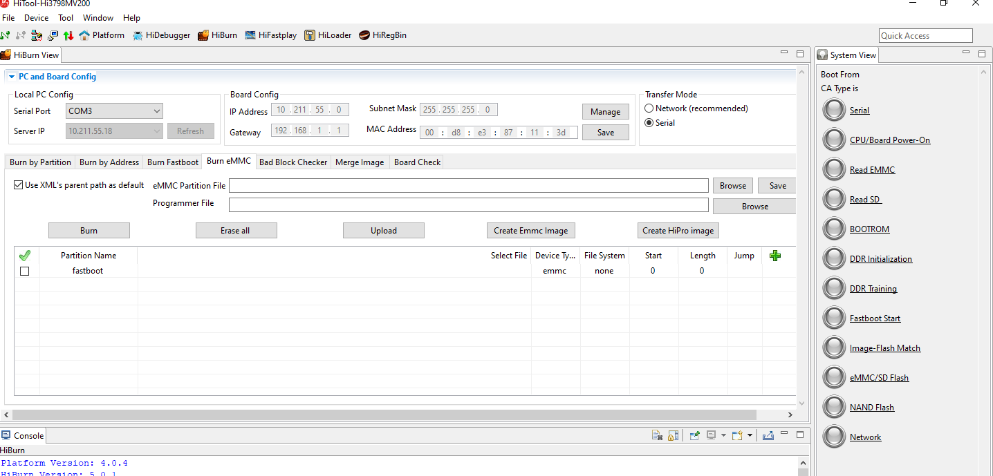 7. A continuacion en serial port seleccionamos nuestro puerto en este ejemplo COM3 y en Transfer mode seleccionamos serial y pulsamos sobre Burn eEmc