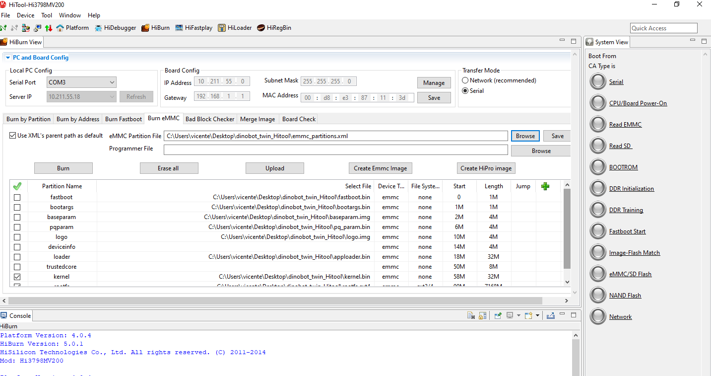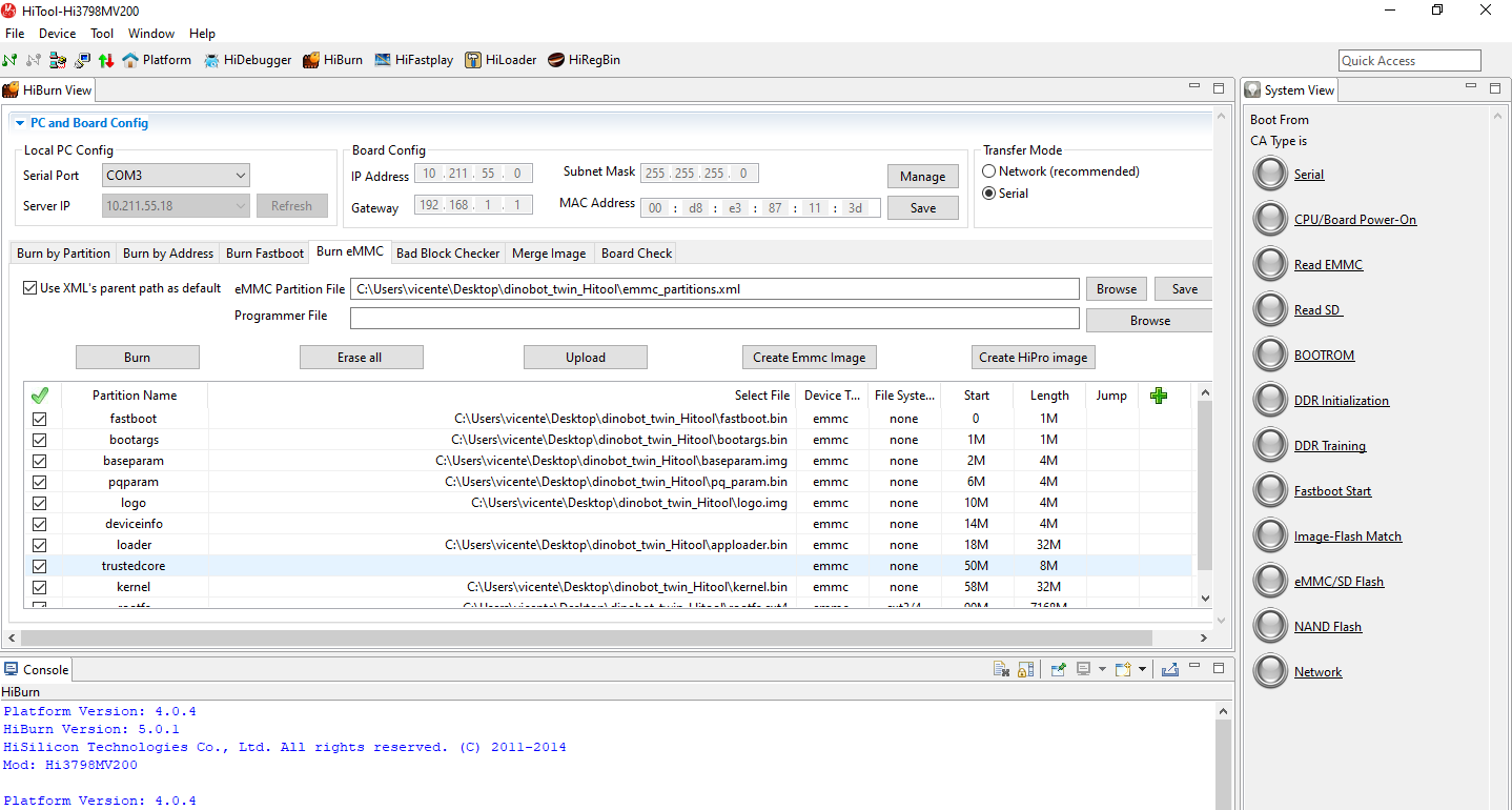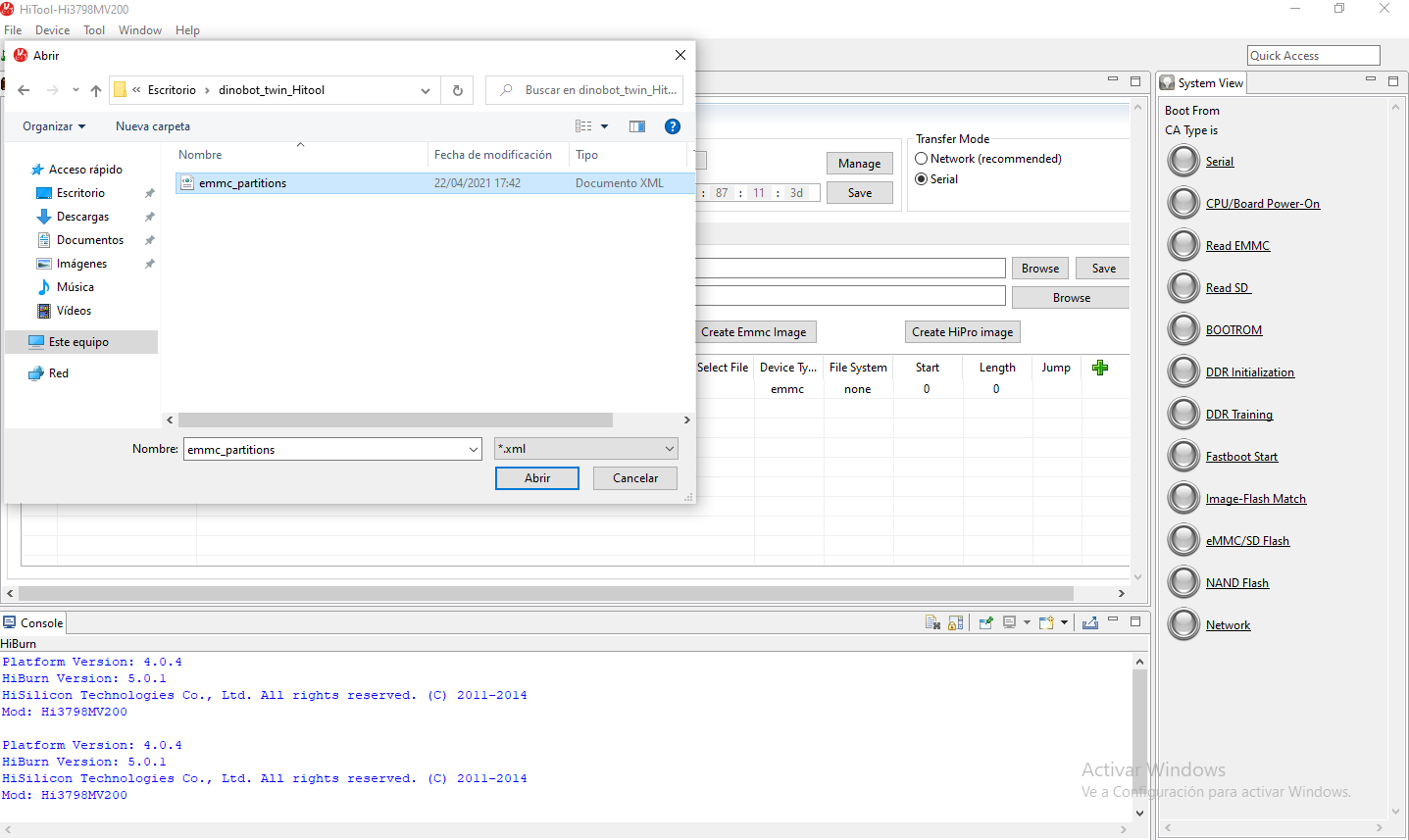 8. Pulsamos sobre browse y en la carpeta del firmware dinobot recovery seleccionamos emm_partitions