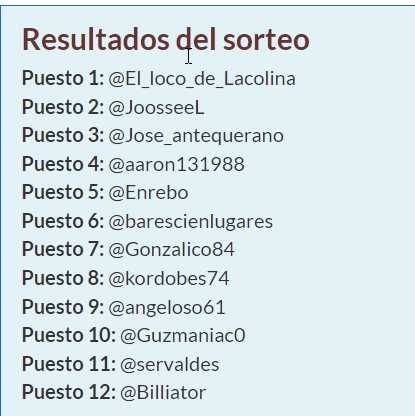 Puesto 3: @Jose_antequerano Puesto 4: @aaron131988 Puesto 5: @Enrebo Puesto 6: @barescienlugares Puesto 7: @Gonzalico84 Puesto 8: @kordobes74 Puesto 9: @angeloso61 Puesto 10: @Guzmaniac0 Puesto 11: @servaldes Puesto 12: @Billiator