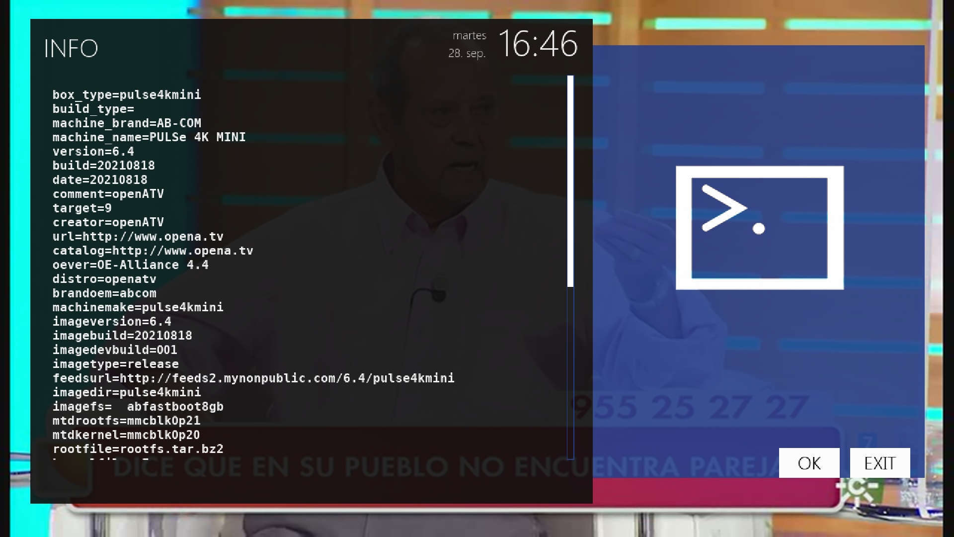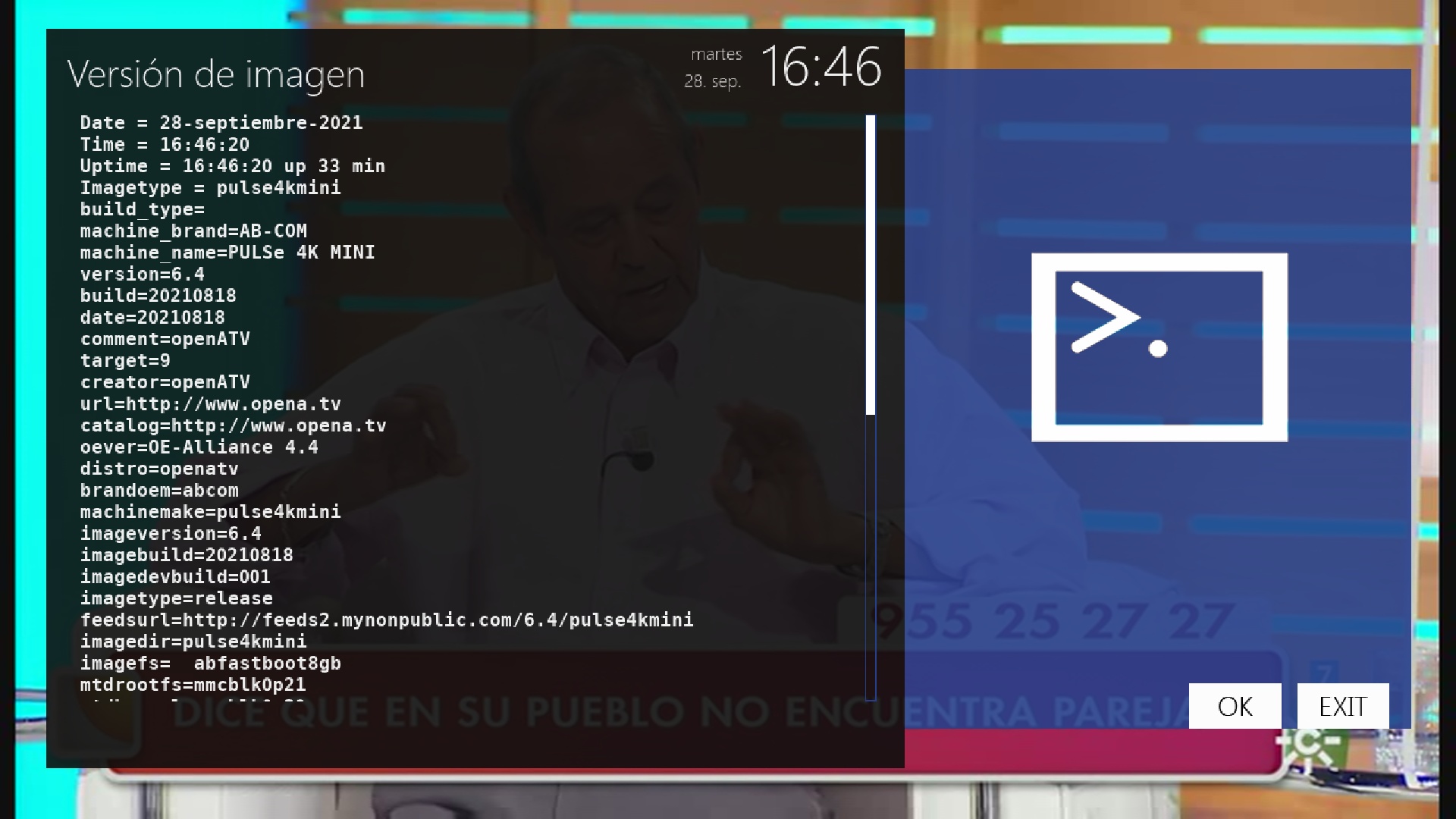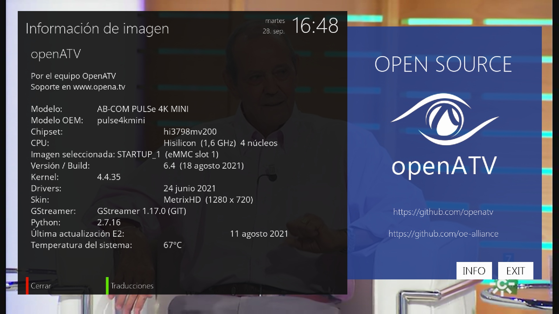 - Version del sistema de fabrica: OpenATV fecha depende de la fabricacion.