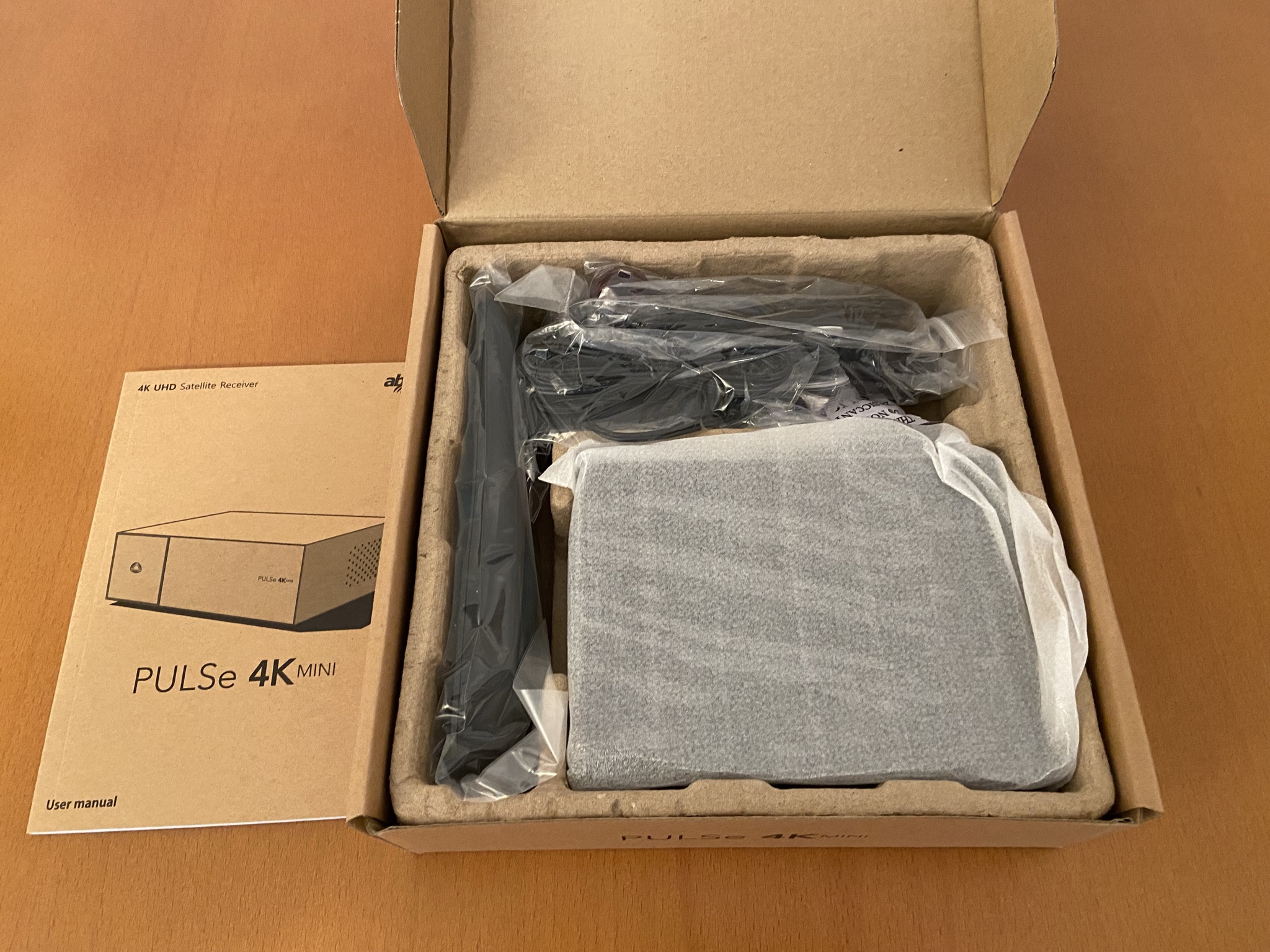 AB Pulse mini 4K se presenta en una caja de carton tipica, color carton, que recuerda al empaquetado Vuplus, en este caso se nota la relacion Abcom con Vuplus, ya que el estilo es muy reconocible, en el interior nos encontramos: