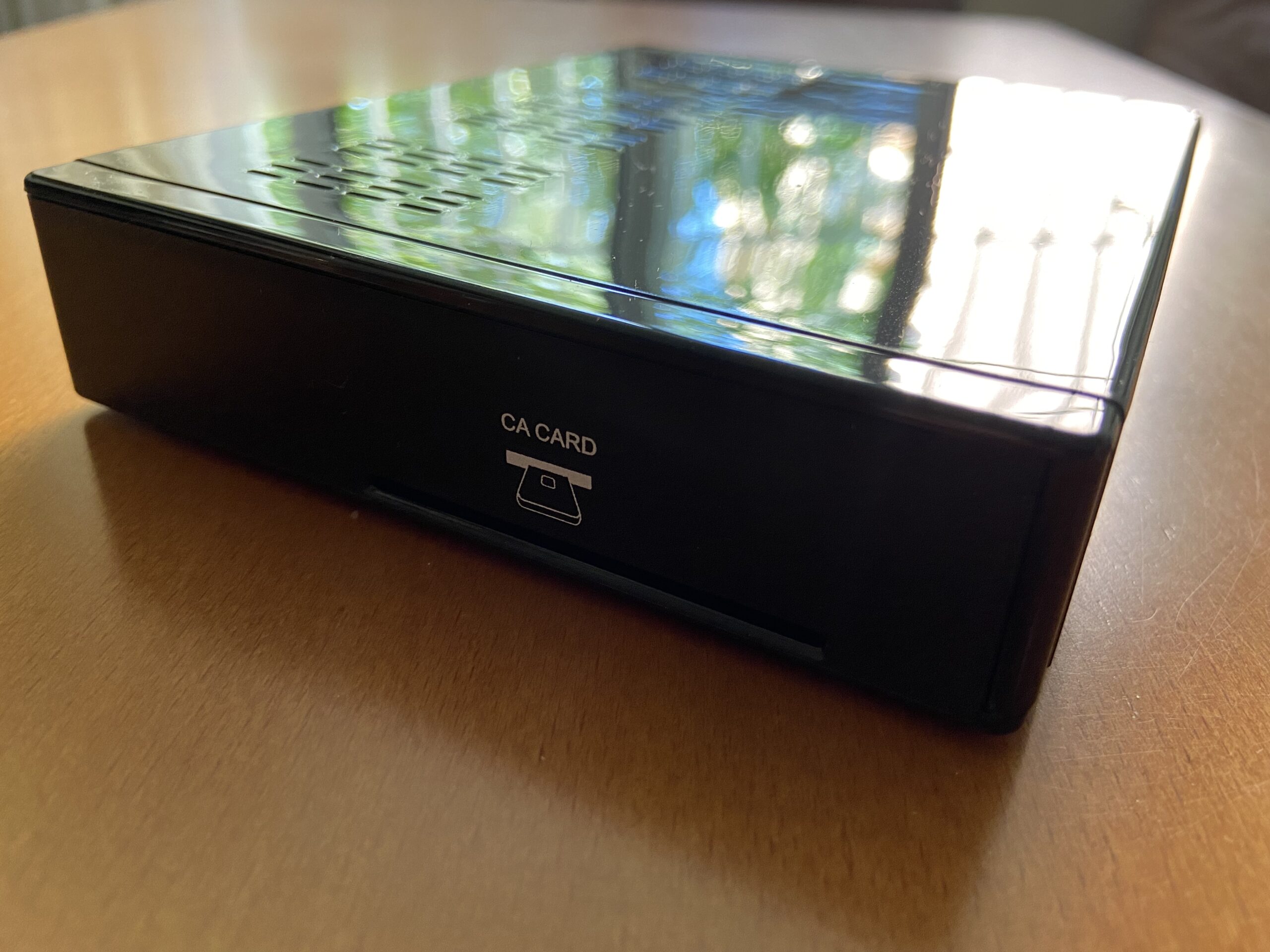 En la parte frontal se halla ubicado pantalla LCD 7 segmentos, asi como serigrafiado marca y modelo del receptor, hallándose en uno de los laterales entrada CA para tarjetas de abonado.
