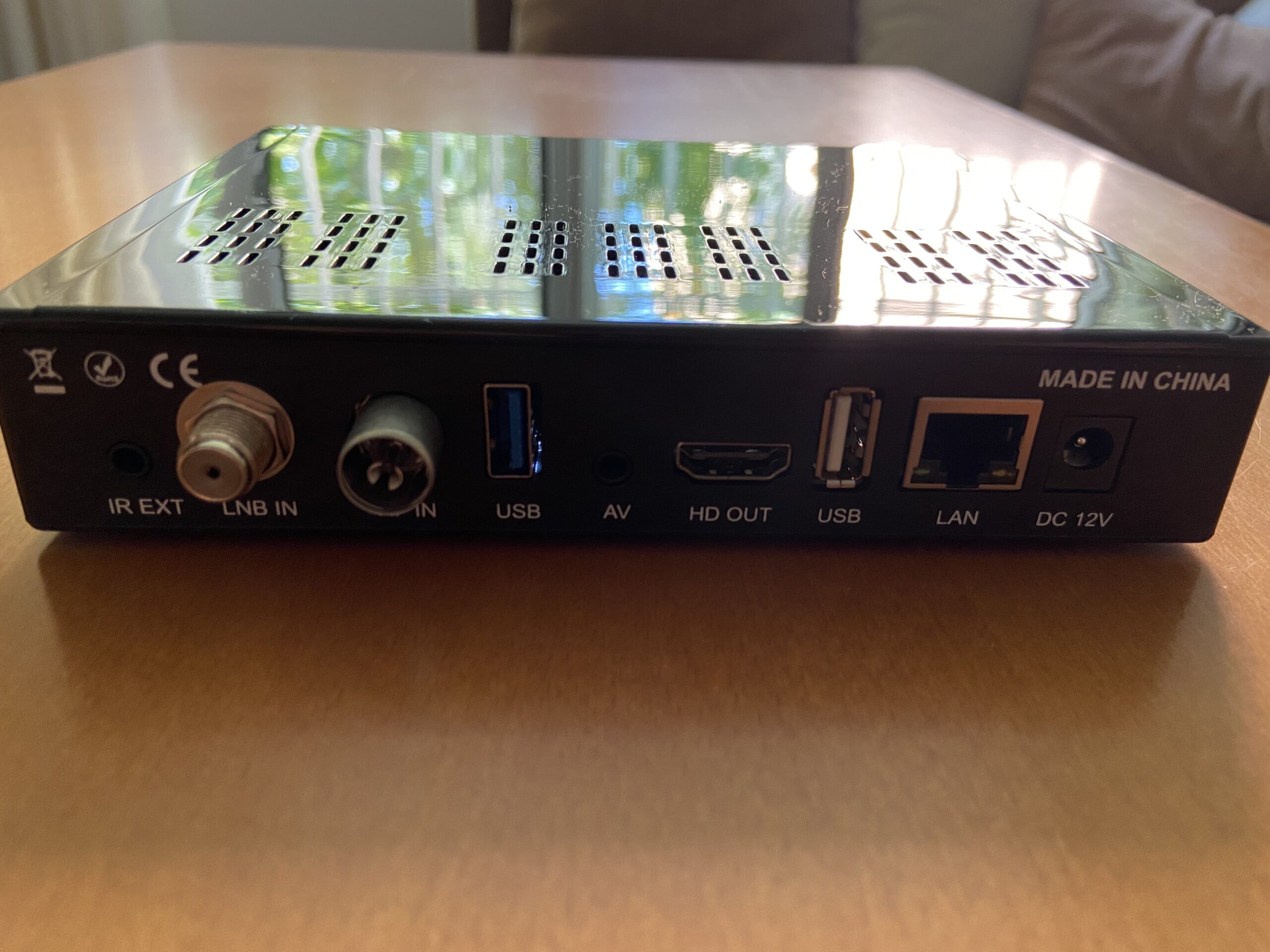 En la parte posterior es donde se hallan el grueso de conectores perifericos, ubicados de izquierda a derecha, entrada IR, tuner satelite y tdt, una entrada usb 3.0, salida AV, entrada HDMI, una entrada usb 2.0, entrada ethernet y entrada adaptador de corriente.