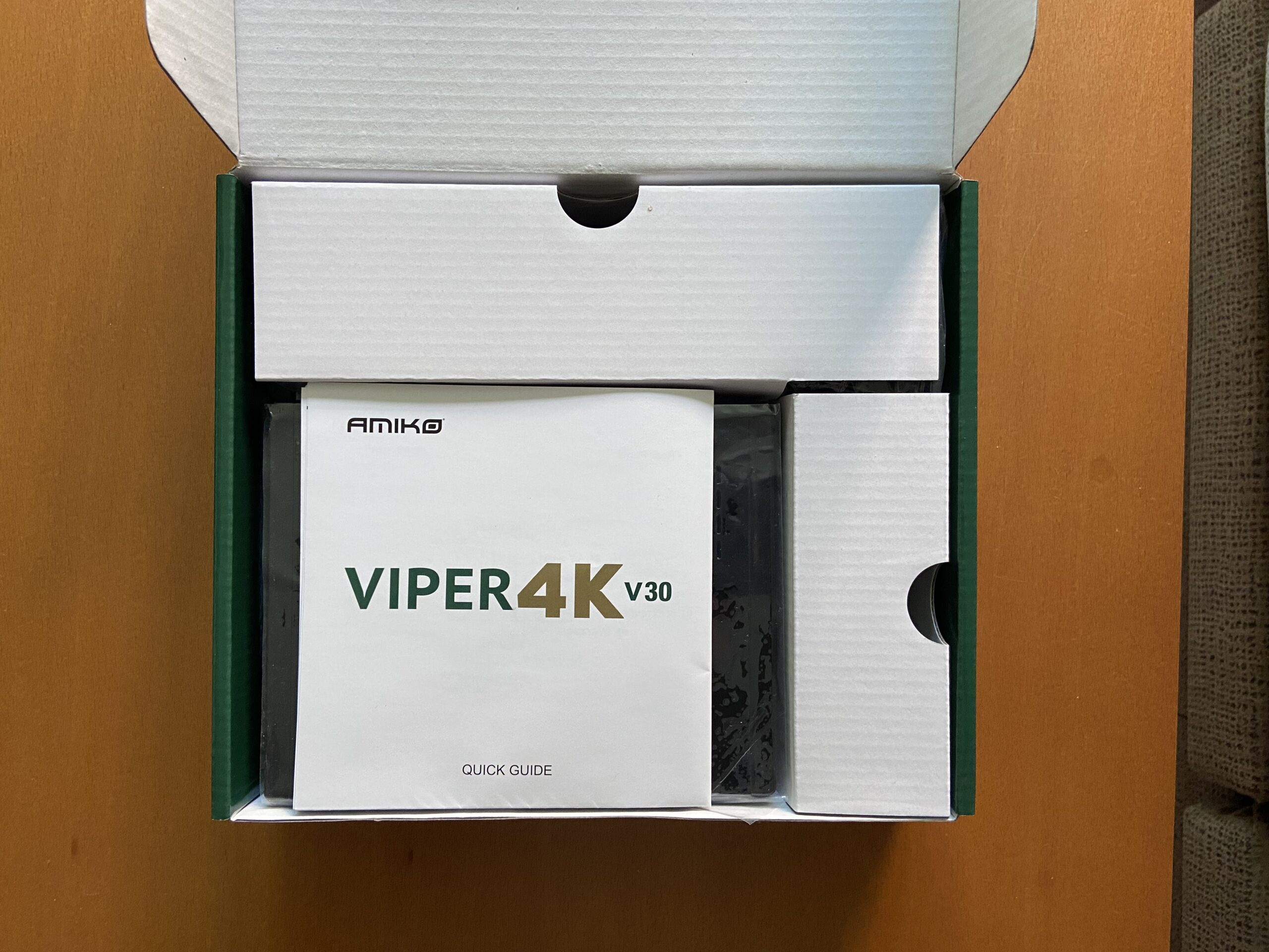 Amiko Viper 4K V30 se presenta en una caja de carton en colores verde y dorado, serigraficado caracteristicas y modelo de receptores, conteniendo en su interior: