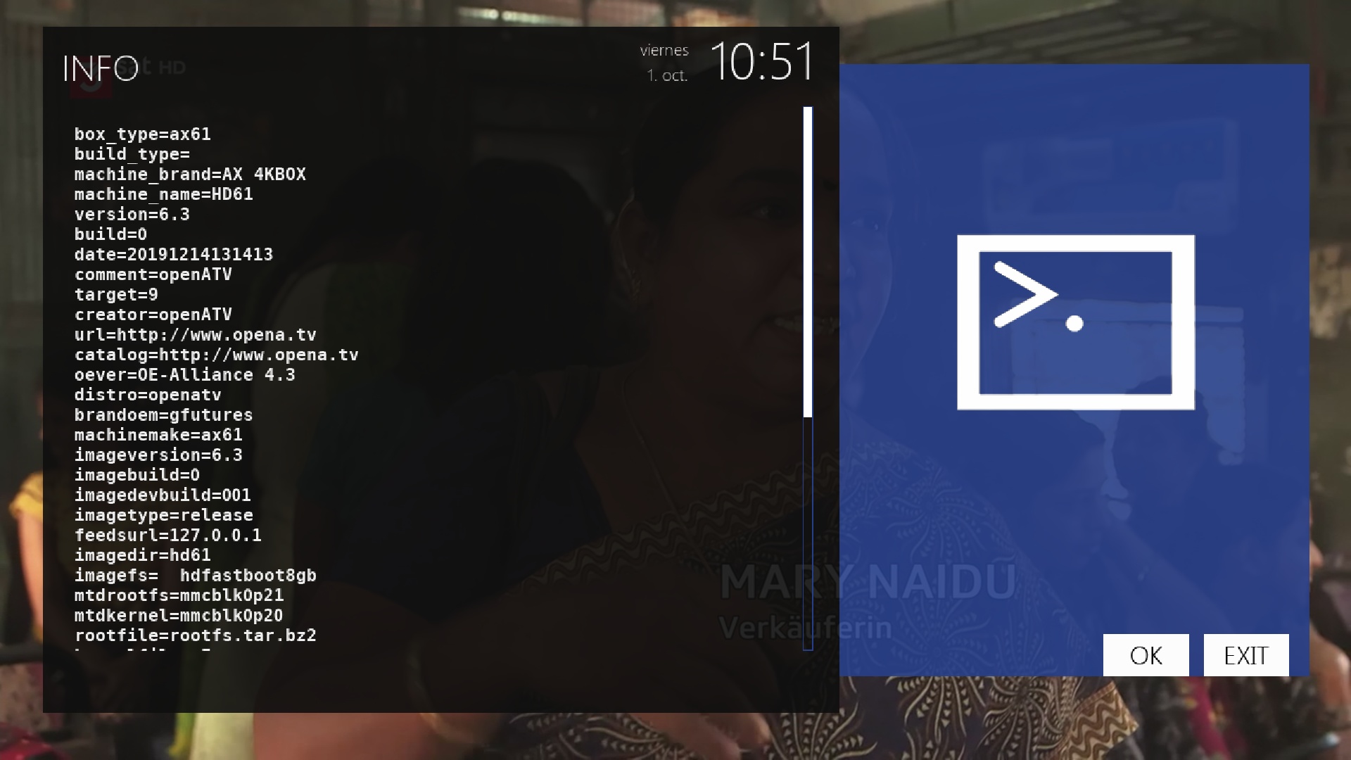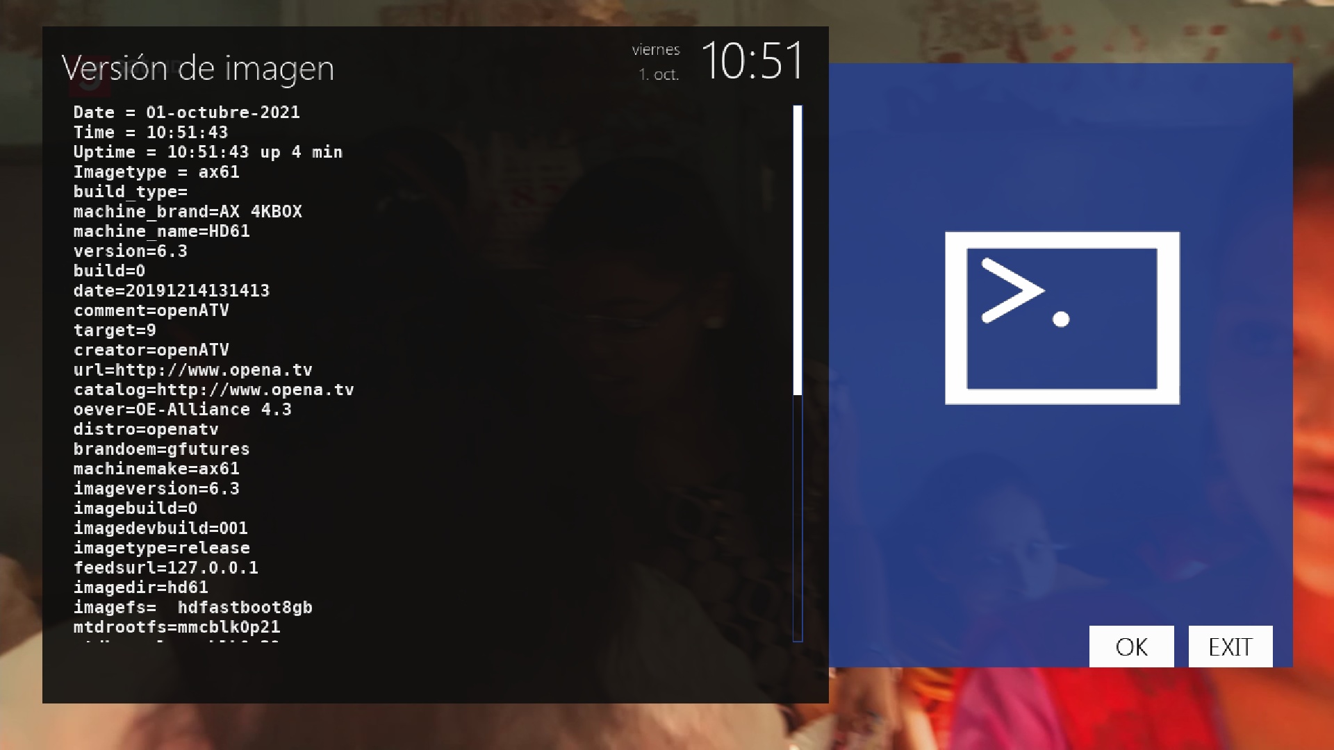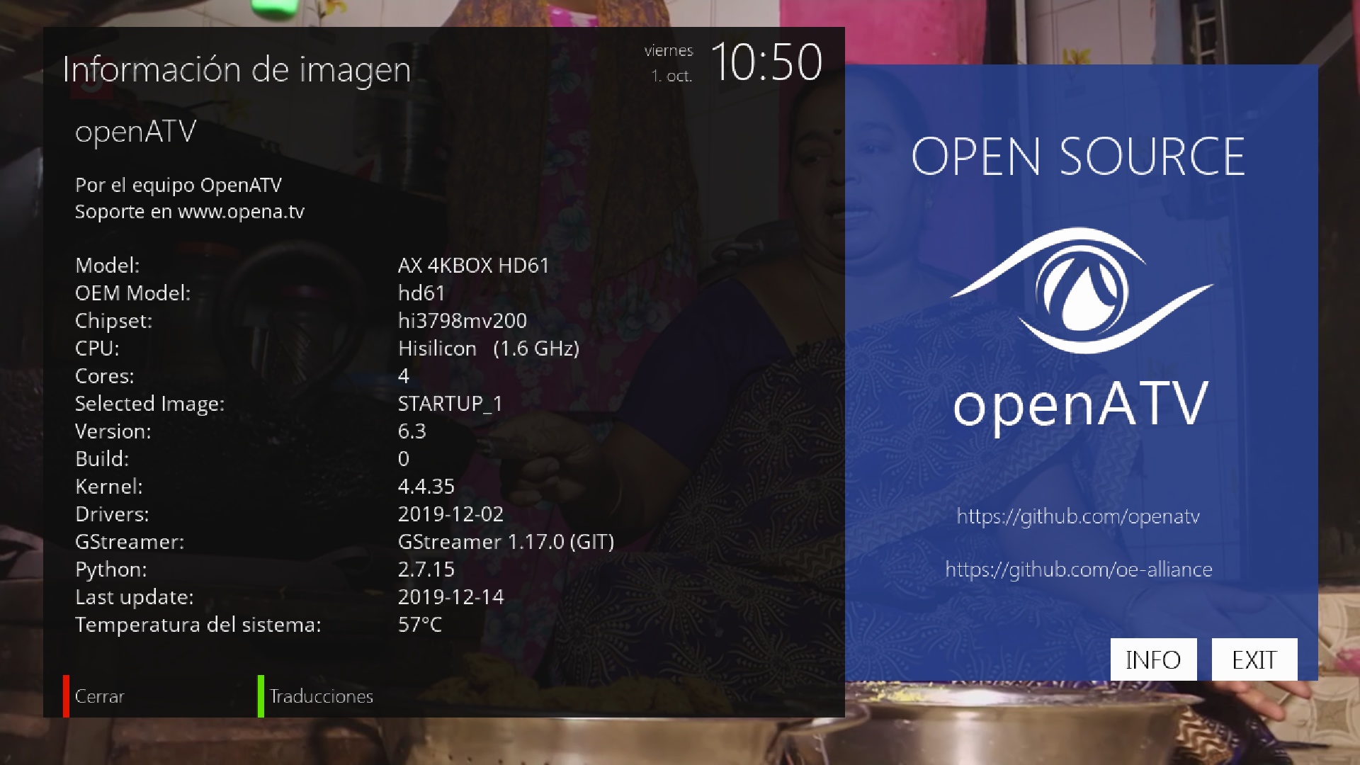 - Version del sistema de fabrica: OpenATV fecha depende de la fabricacion.