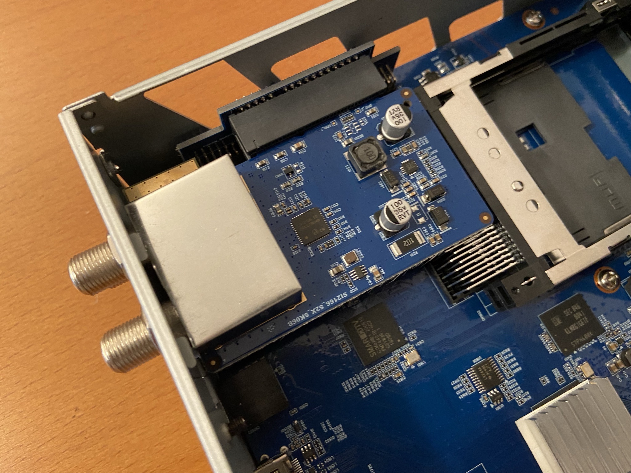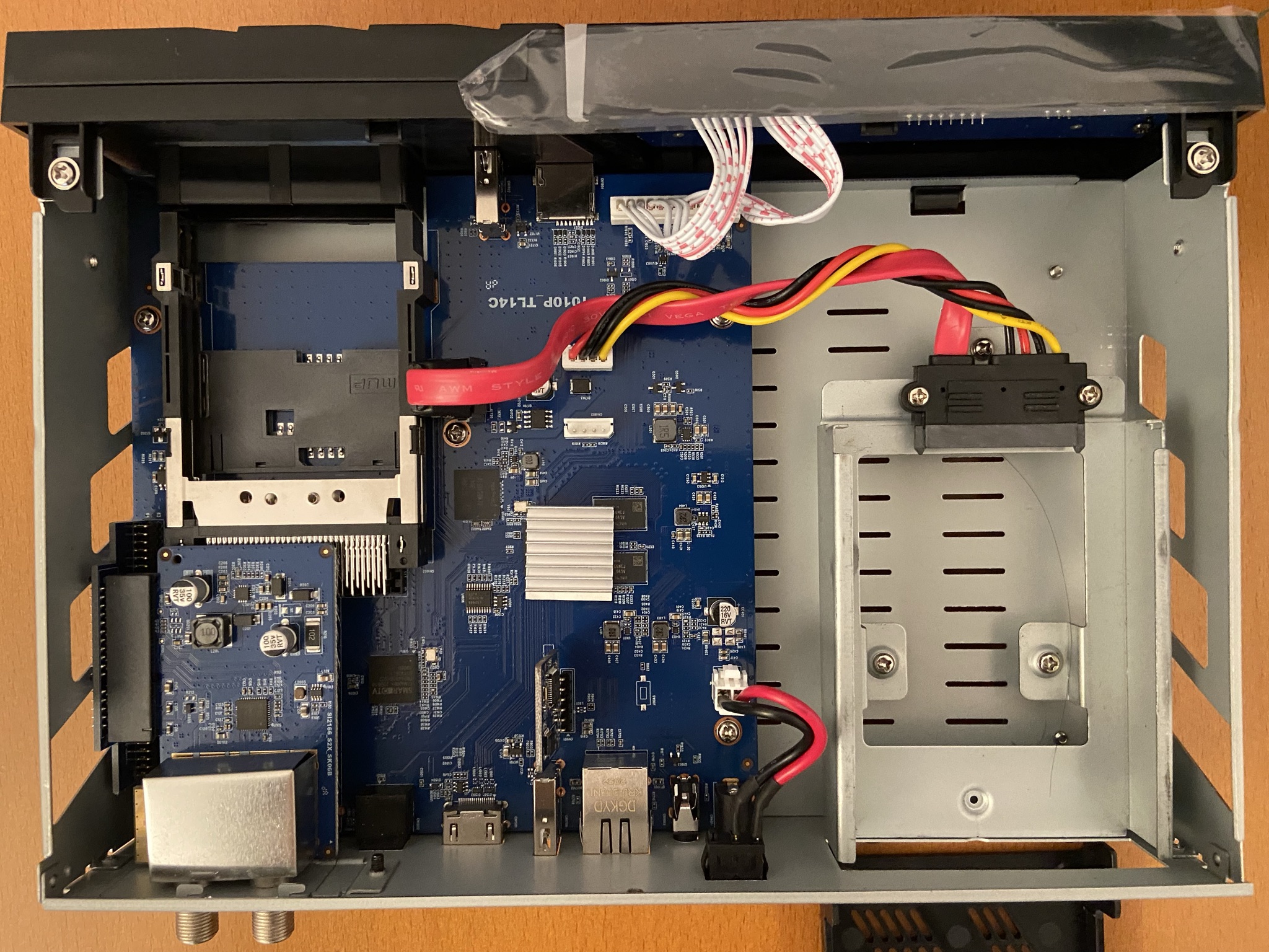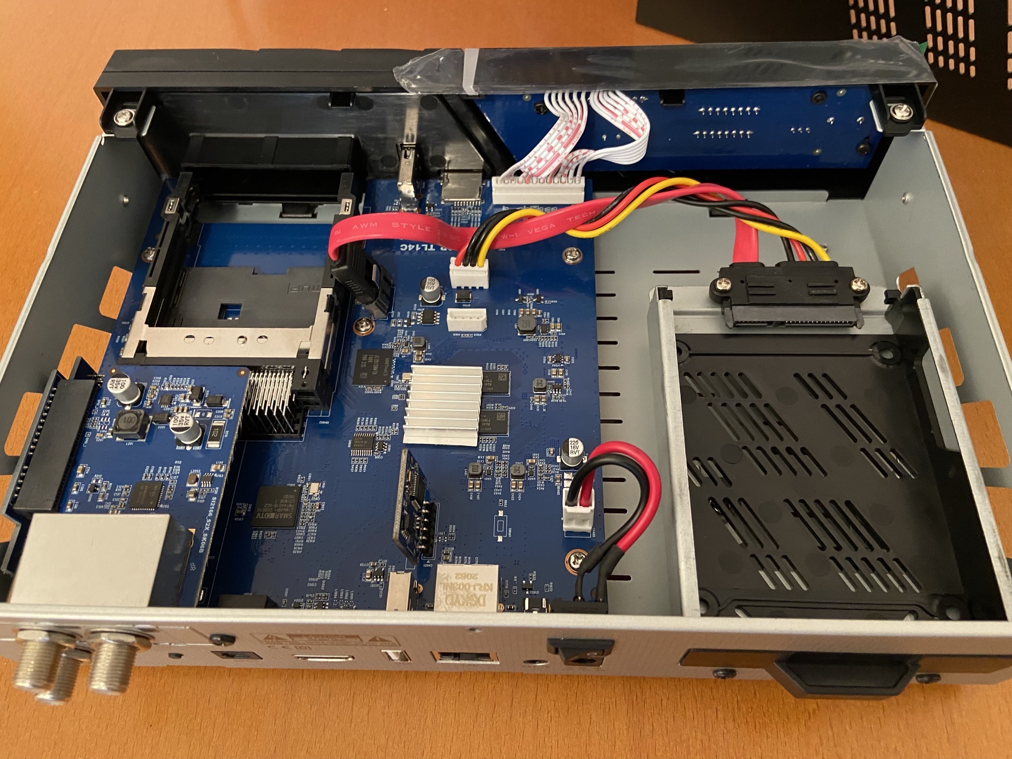 AX 4K Box HD61 esta construido con materiales de alta calidad y como hemos comentado tiene la posibilidad de un tuner intercambiable y bahia posterior para disco duro interno, os dejamos capturas del corazon del receptor