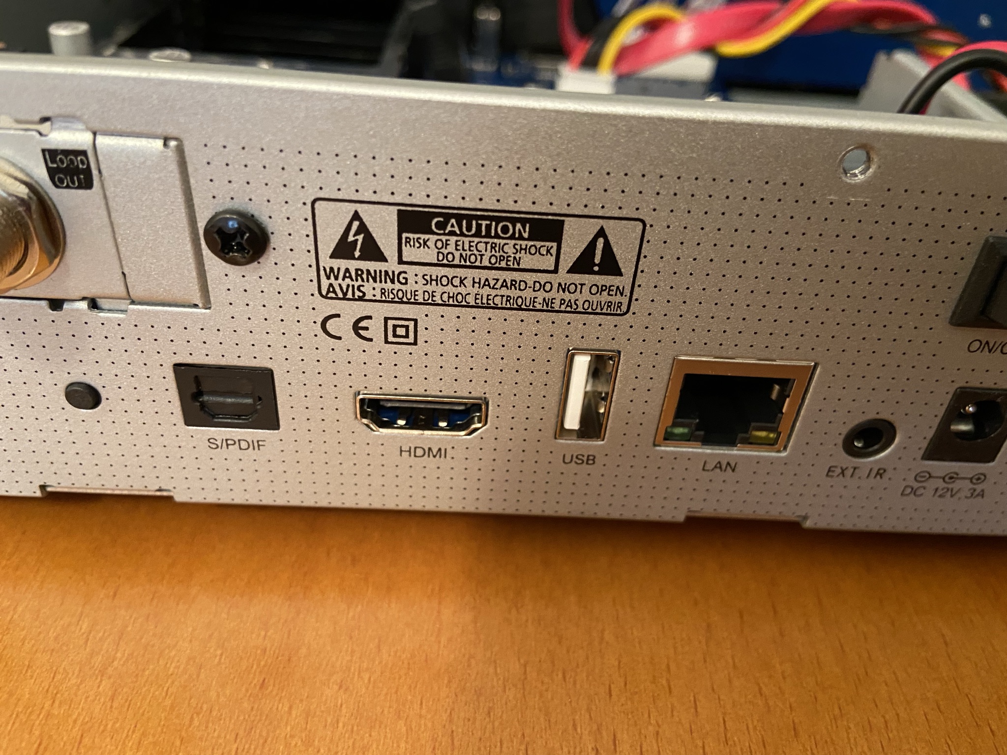 En la parte posterior es donde se hallan el grueso de conectores perifericos, ubicados de izquierda a derecha, tuner de fabrica satelite y tuner intercambiable que puede ser tdt o satelite, entrada spif, boton recovery, entrada HDMI, usb 2.0, entrada ethernet, entrada adaptador infrarojos, entrada corriente y boton de apagado y bahia disco duro interno.