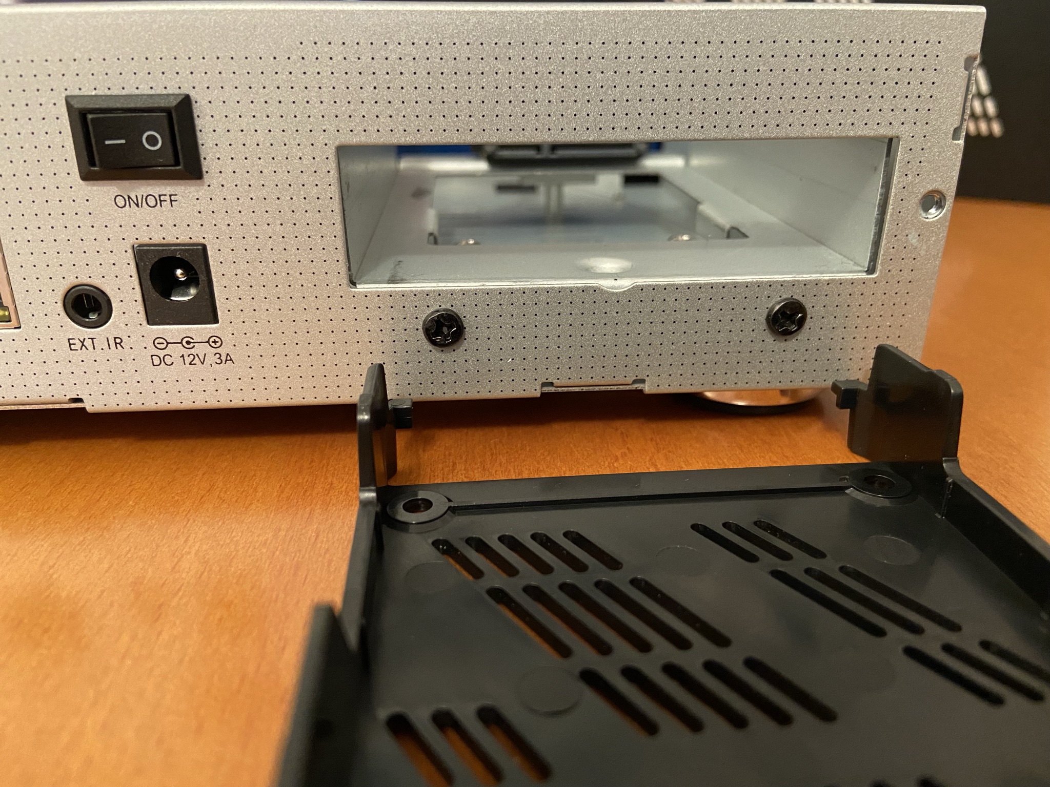 En la parte frontal se halla ubicado pantalla de 7 segmentos con boton POWER digital, con modelo de receptor serigrafiado en relieve y tira luminosa led. ranuras de ventilación en la parte superior asi como en laterales. En esta misma parte frontal esta ubicada tapa la cual en su interior da acceso a entrada USB 2.0, tarjeta sd, asi como acceso a card reader y dos CI slot.