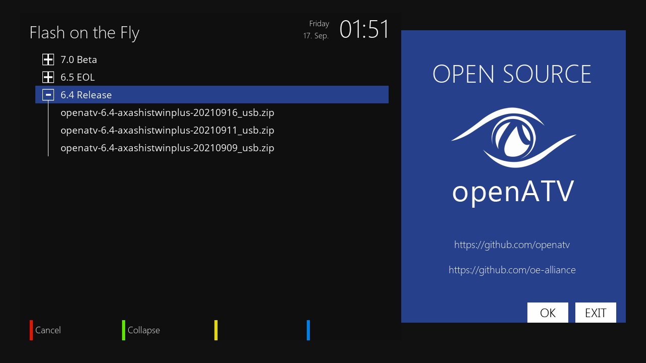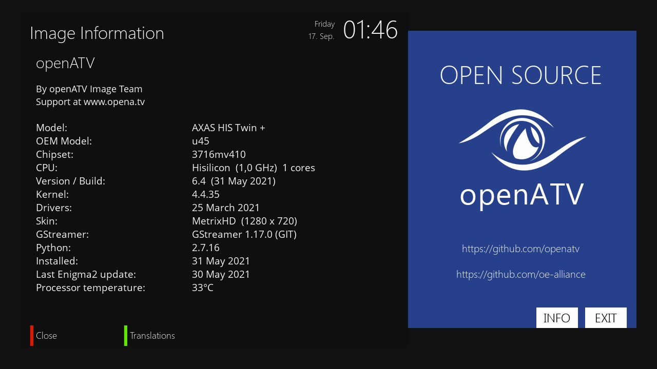 - Version del sistema de fabrica: OpenATV fecha depende de la fabricacion.