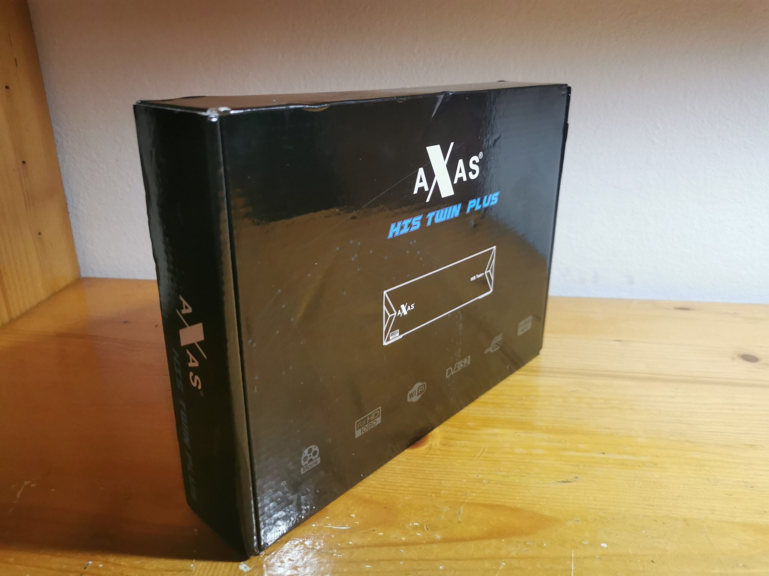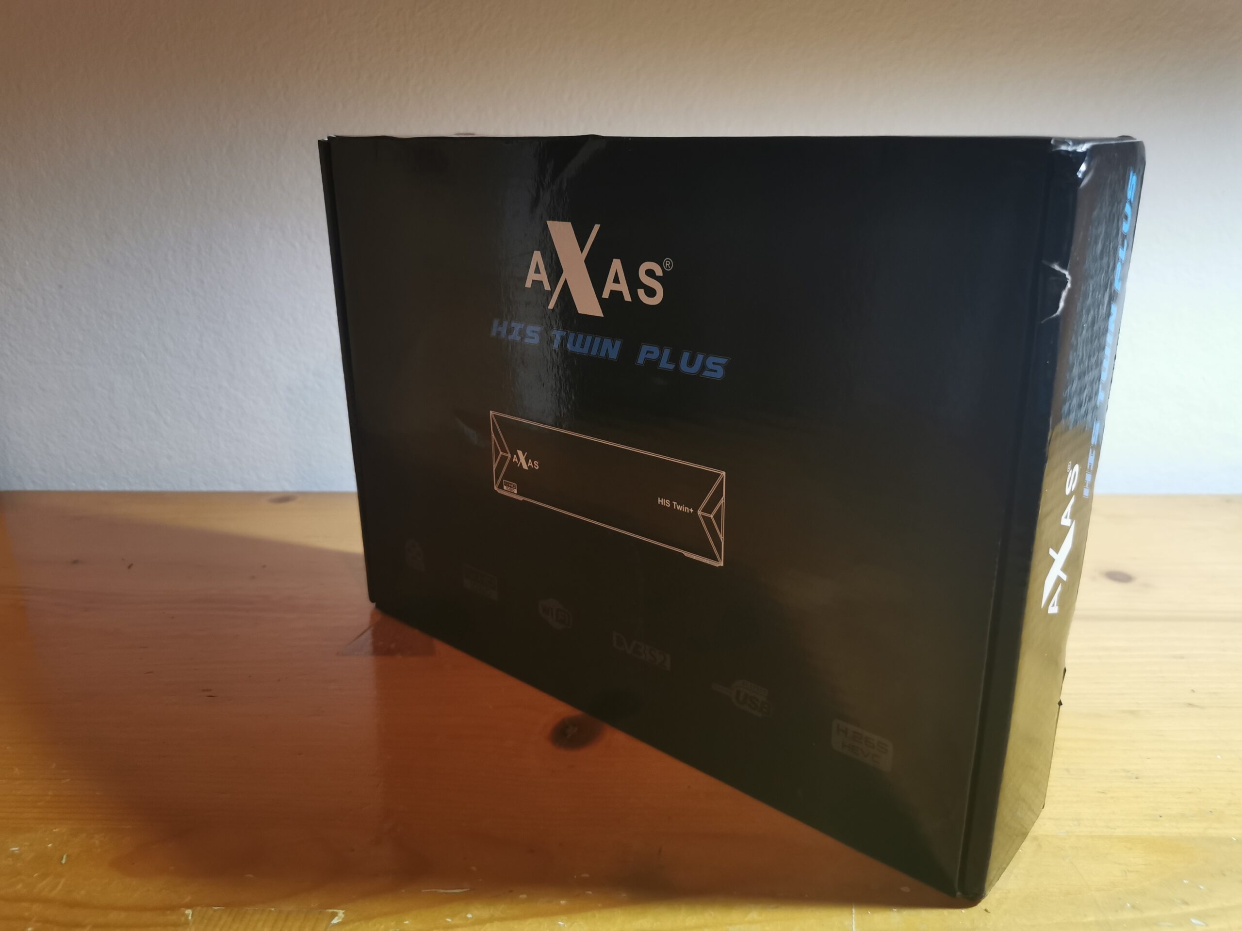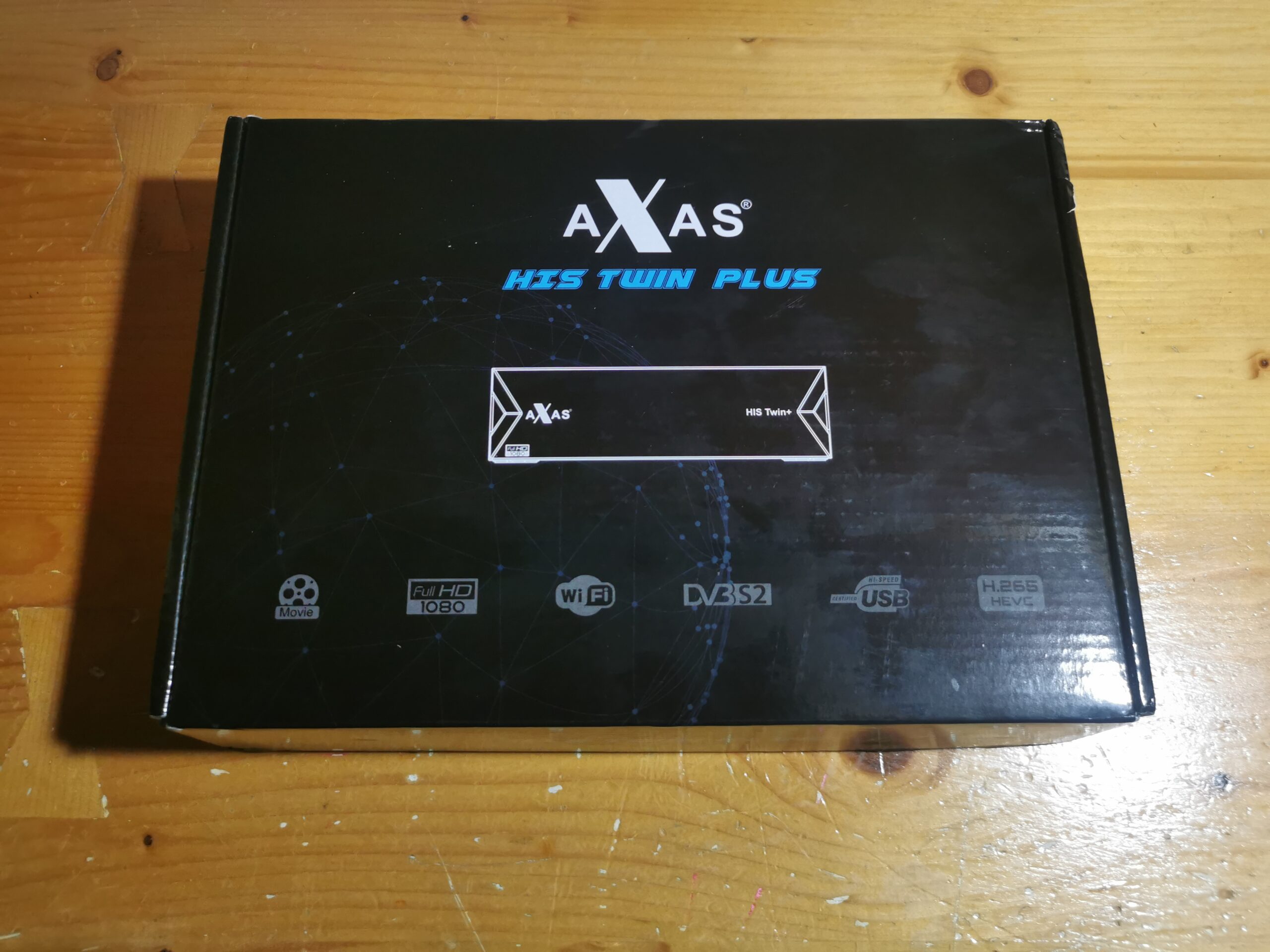Axas His Twin Plus se presenta en una caja de carton tipica, color en tonos oscuros, donde aparece serigrafiado modelo receptor y sus caracteristicas: