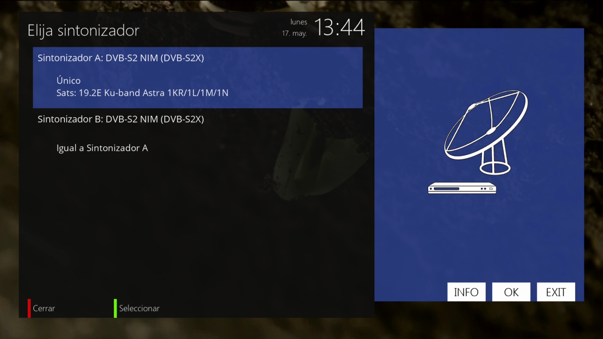 Se comercializa con dos tuner para satelite, sin loop interno, es decir deberemos conectar ambos tuner externamente con un splitter.