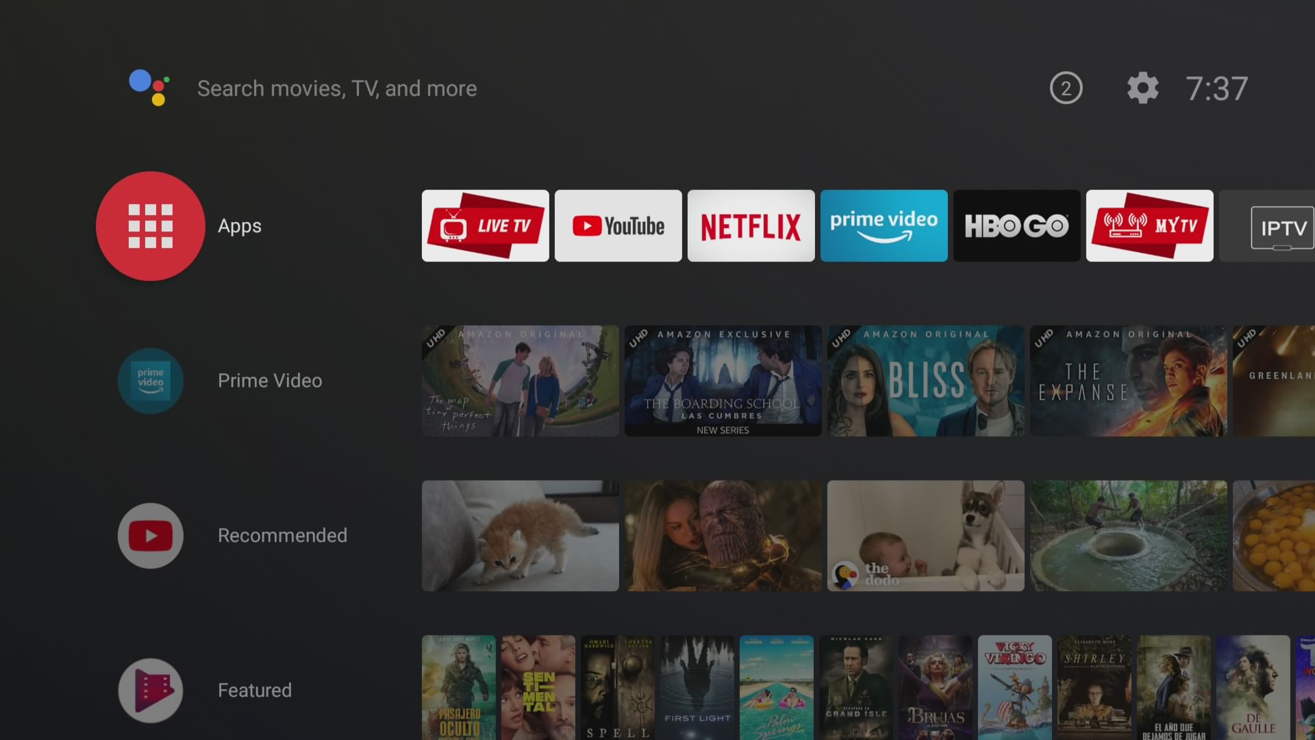 - Launcher: Launcher normal de Android TV con lanzador de apps para Android normal / Android UI renderiza a 1080p.