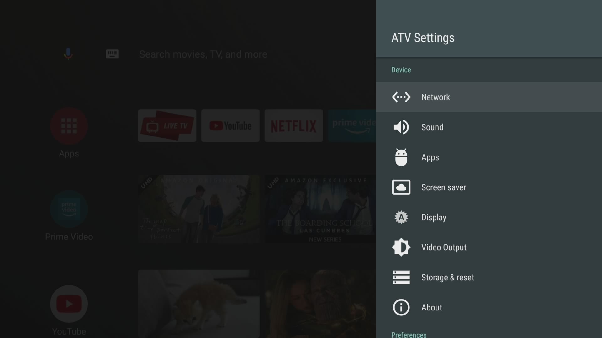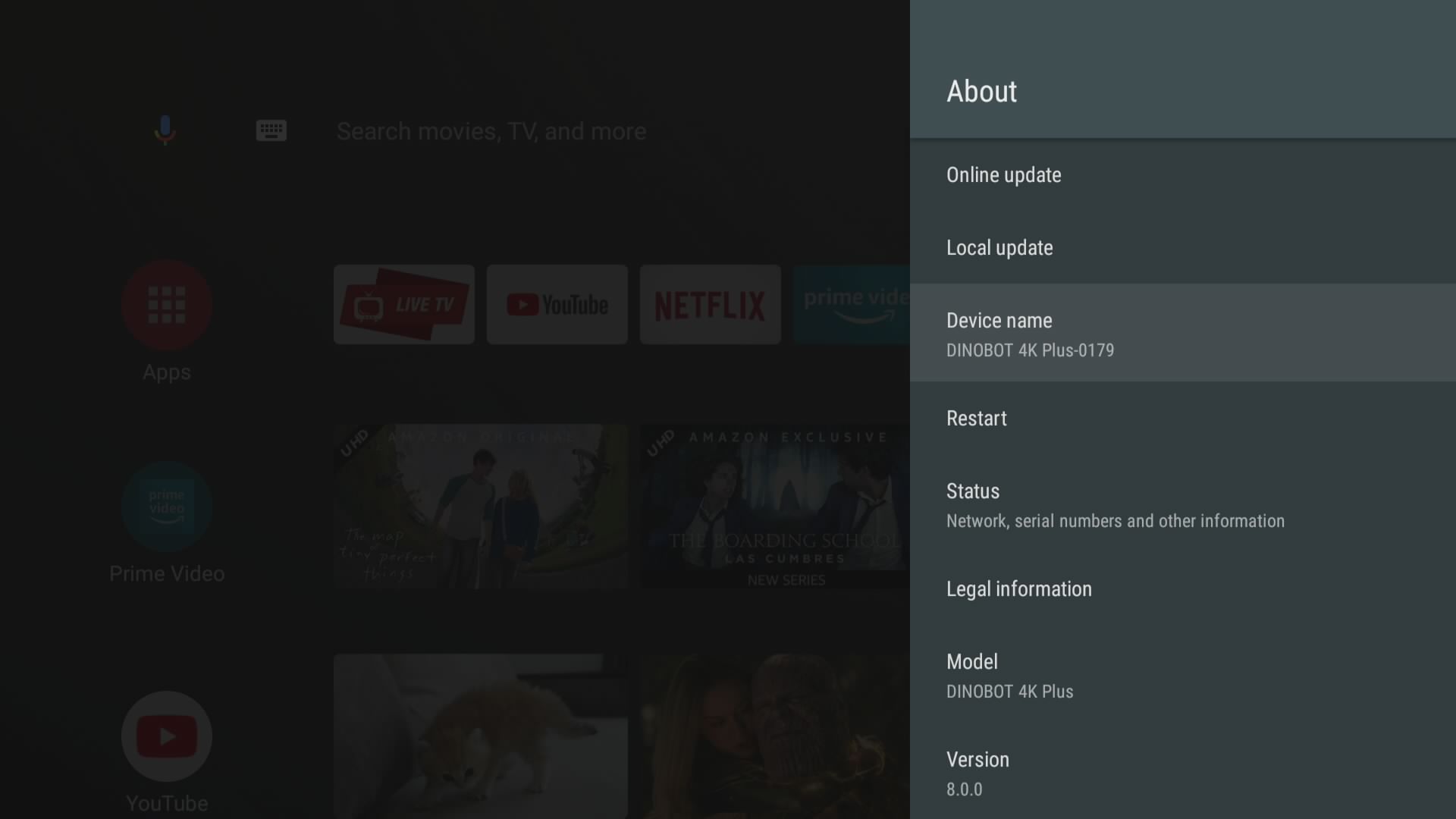 El sistema Android usado por Dinobot 4K+ se denomina ATV, siendo su ultima version disponible Android TV 8.0, por este motivo tiene dos tipos de menus de configuración de android: ATV Settings con los menús laterales destinados a ajustes del TV-Box y otro denominado Settings con los ajustes de Android clásico.