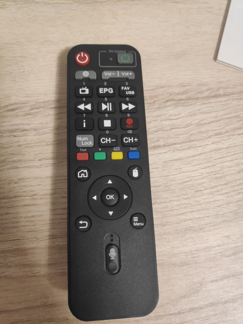 El mando tip Flymouse cuenta con posibilidad de conexion Bluetooth asi como infrarojos. El mando cuenta con micrófono integrado que nos permite usar para distintas app en android a traves de voz. En el mando tenemos todas las funciones de Android además de las teclas necesarias para controlar el sistema enigma2.