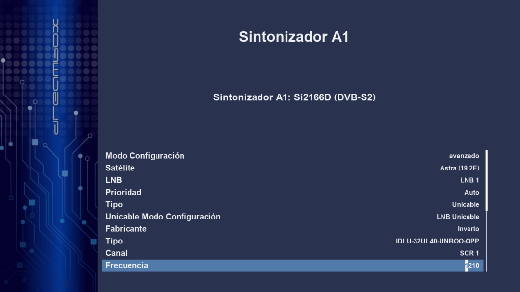 El sintonizador satelite es el modelo Si2166D DVB-S2X que permite captar canales tanto multistream, S2X y T2mi